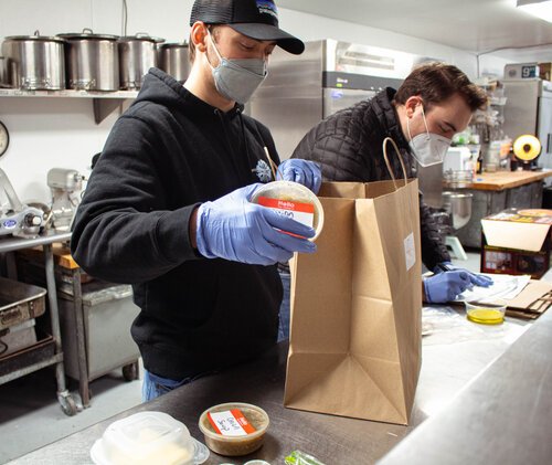 Back in 2020, The Baldwin began delivering meals 90 percent ready so that people could finish cooking the meals at home as in-house dining had been eliminated due to the pandemic. Here Griffin Martin and Andrew Scardina work on preparing deliveries at the Baldwin Saloon. The Martins tried many iterations to keep the restaurant going.