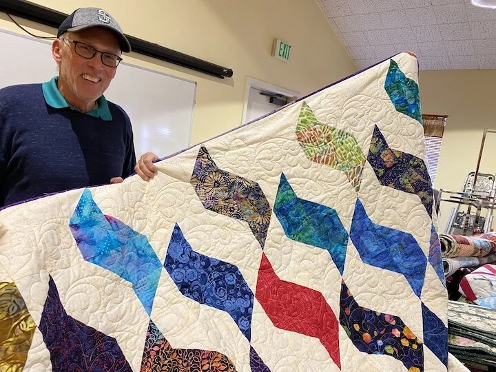 Scott McKay at the Mid Columbia Senior Center shows off a quilt that is being raffled. It and others that will be for sale at the Vendor, Craft & Flea Market set for Saturday, June 5.
