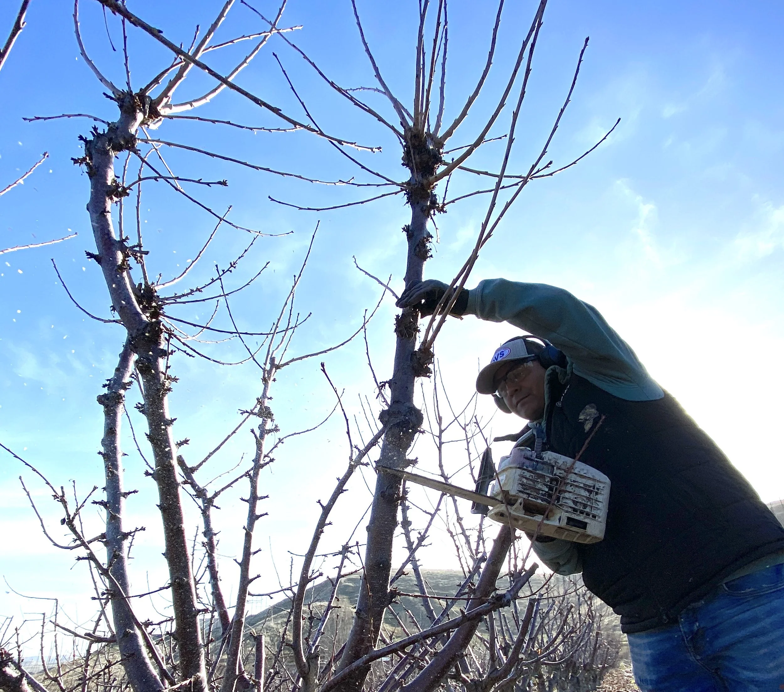 The Dalles, Ore., Feb. 26, 2025 — Miguel Abesada and Jose Misael Avalos were greated by a warm winter sun this morning in East The Dalles as they pruned cherry trees at Wade & Rufener Orchards just south of Adventist hospital.