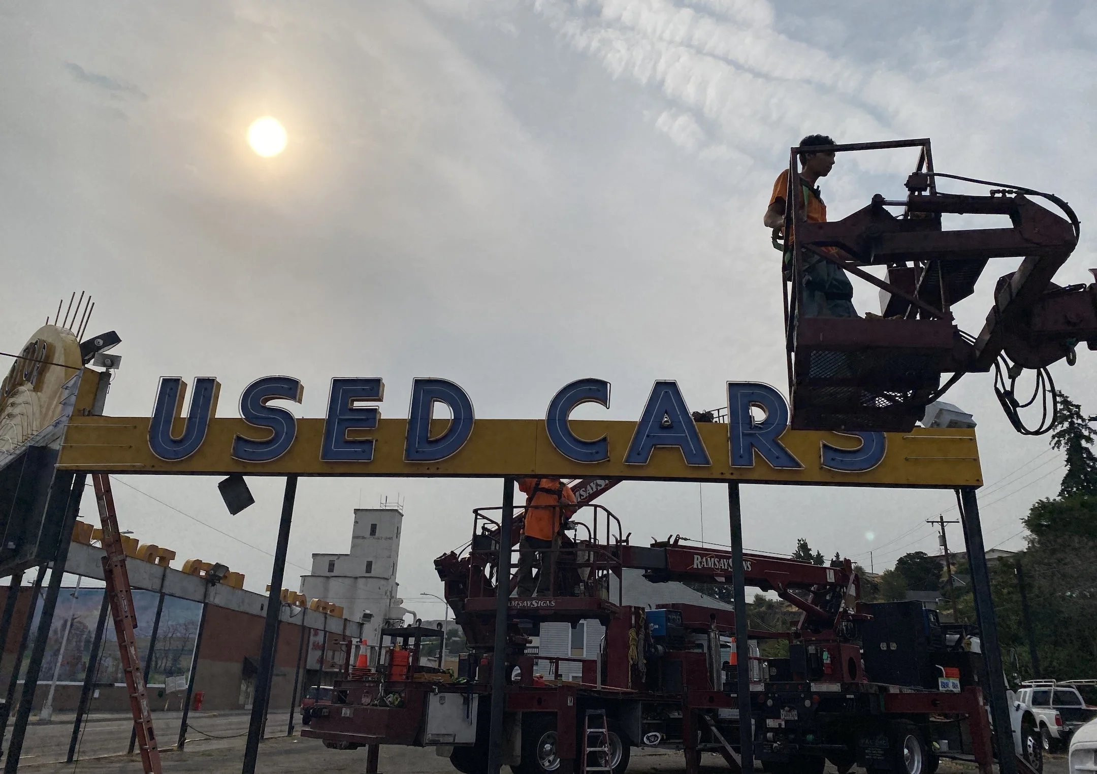 The Dalles, Ore., Aug. 1, 2025 — Ramsey Sign Company and David Benko of the National Neon Sign Museum were moving “CARS” this morning on East 3rd St. in The Dalles.