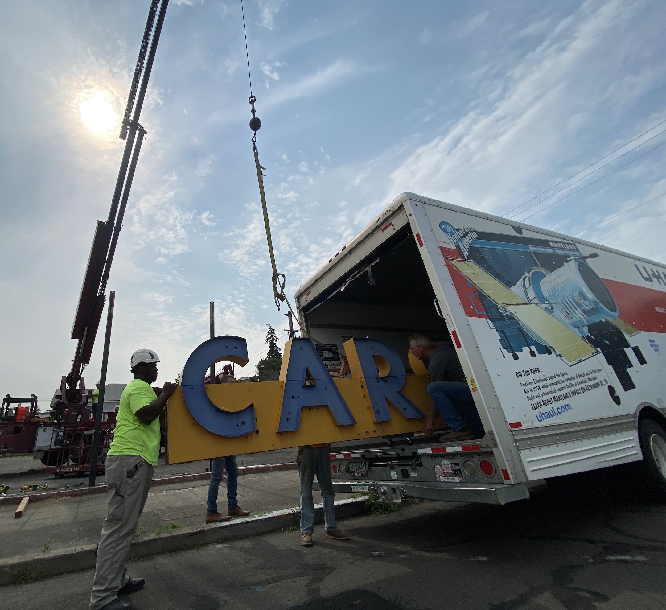 Benko said he rented a U-Haul truck this morning and received help from friend Anthony to help him take the sign apart and get it loaded. He intends to store it temporarily in Portland.
