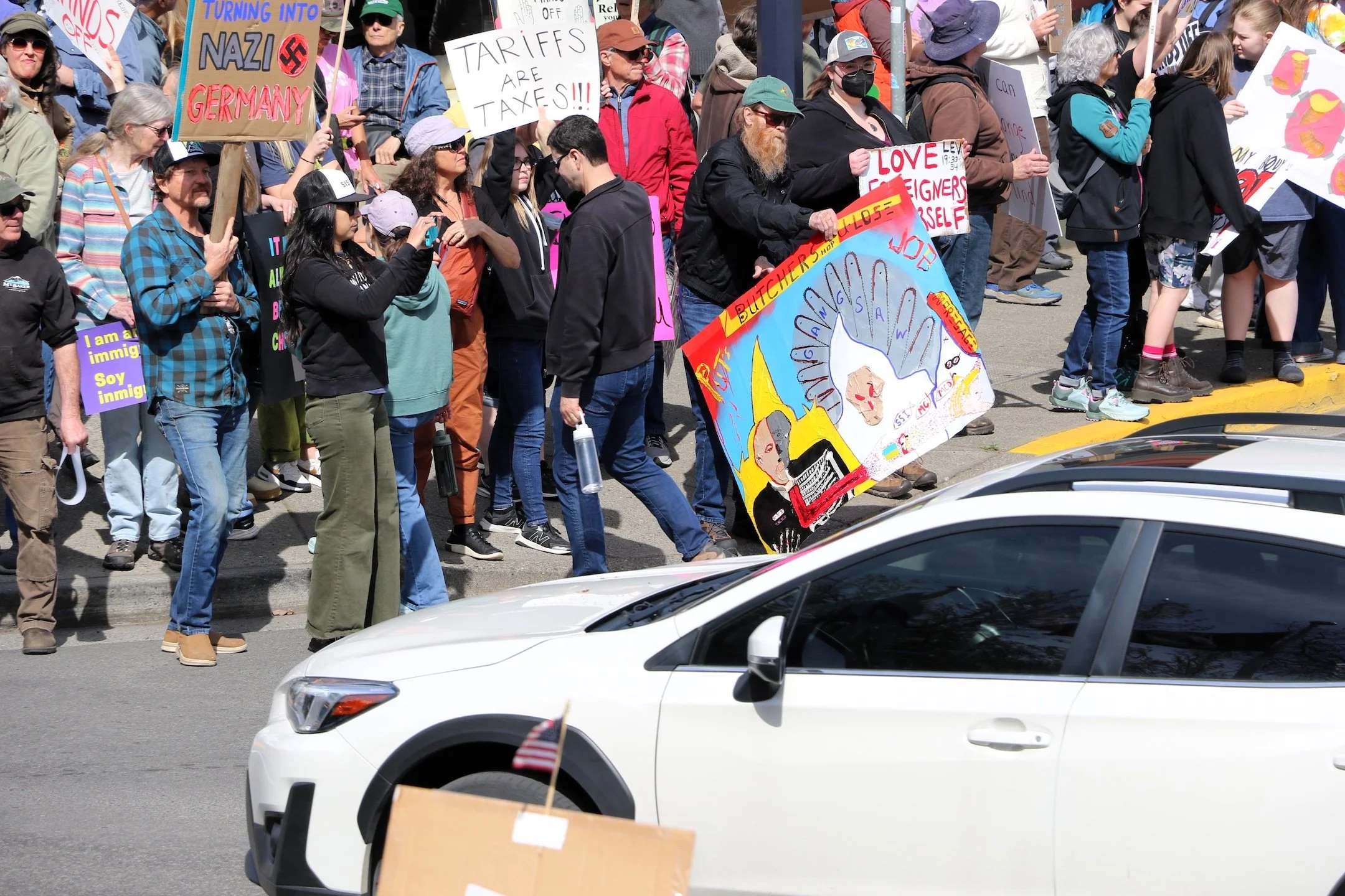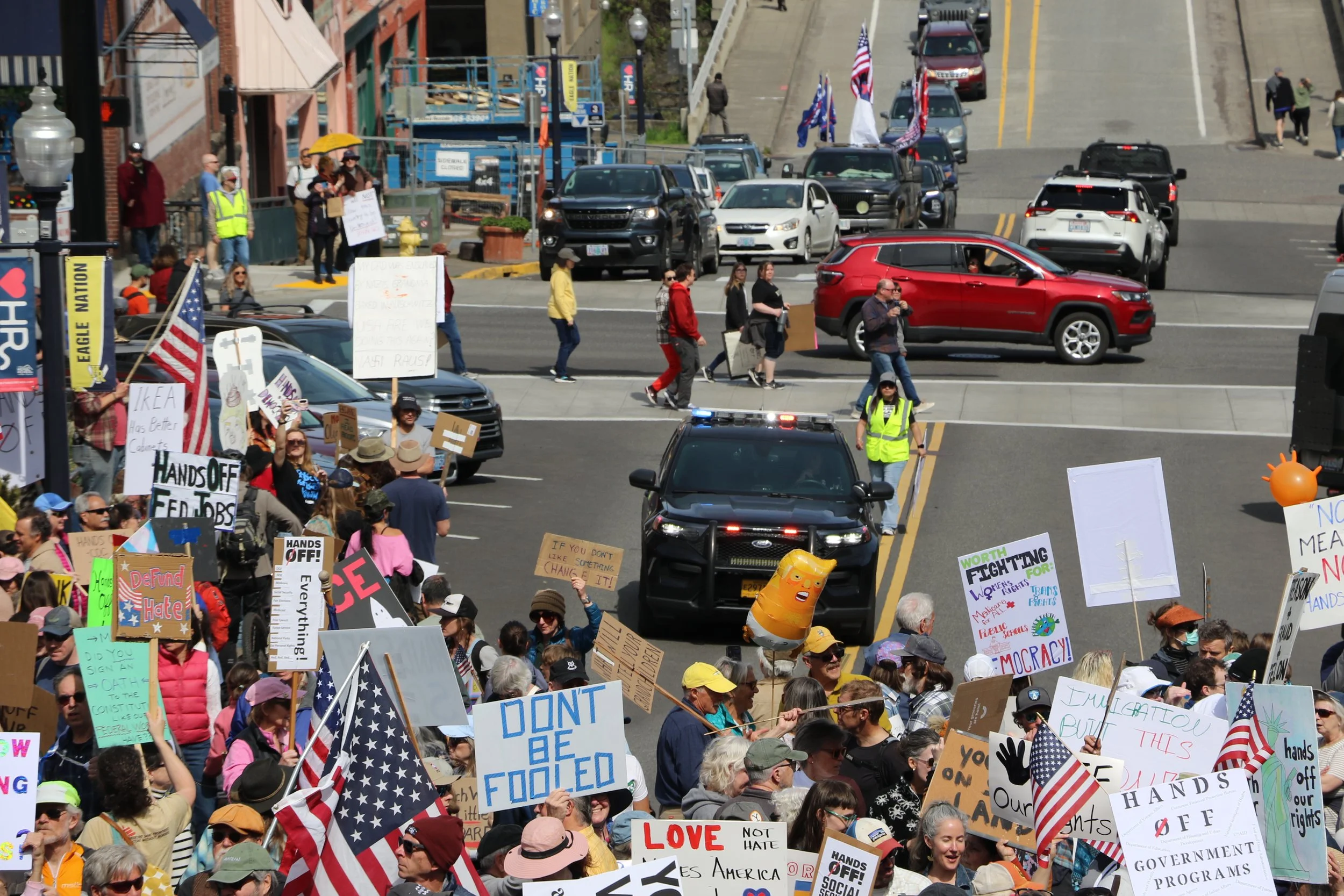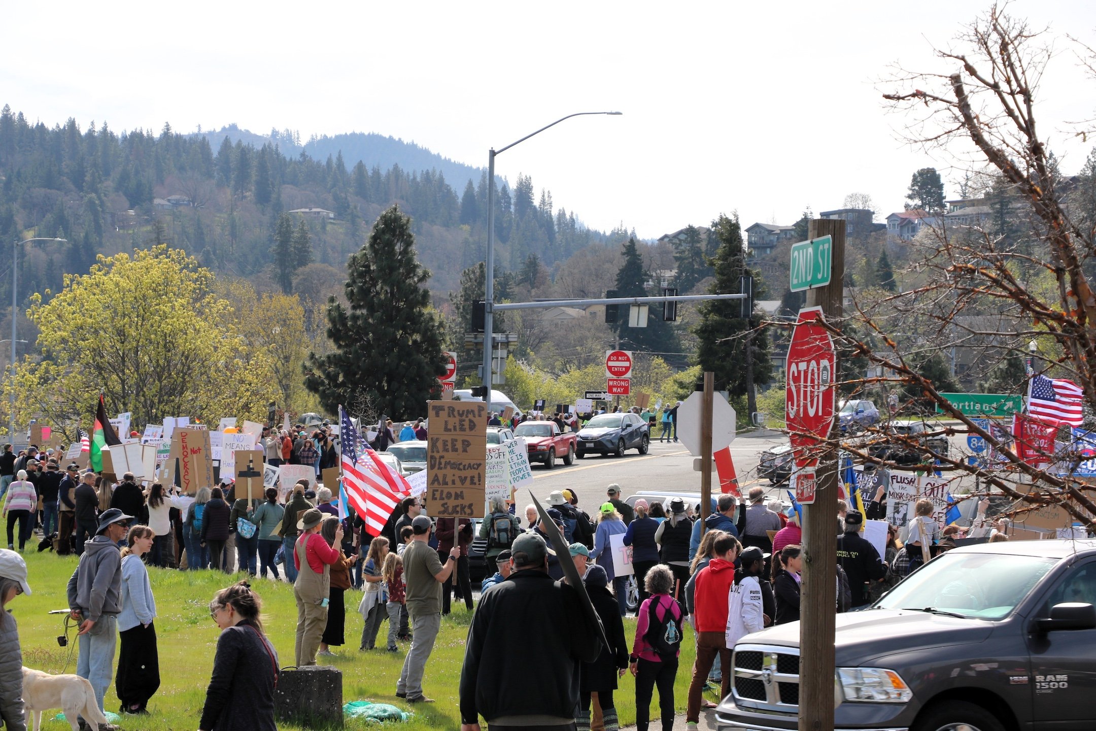 Protestors pack Second and State streets in Hood River on Saturday afternoon, April 5, as they lament the policies of the Trump administration.