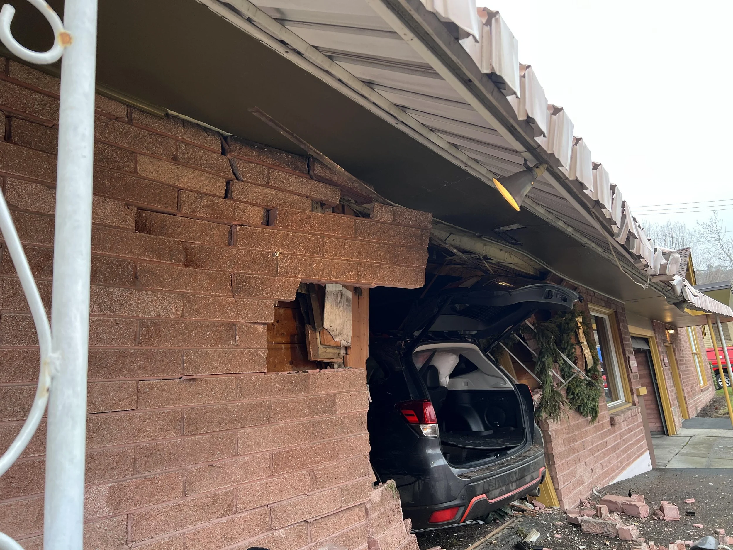 The car went across 10th Street and hit the curb in front of Spencer Libby and Powell. It appears its left front tire ran up the concrete runner on the side of the entrance steps to the front door as a ramp to climb up four plus feet before striking the front door and the brick of the building. The Forrester crashed through the wall. It went through the lobby then through an interior wall and into the viewing room of the funeral home before coming to a stop.
