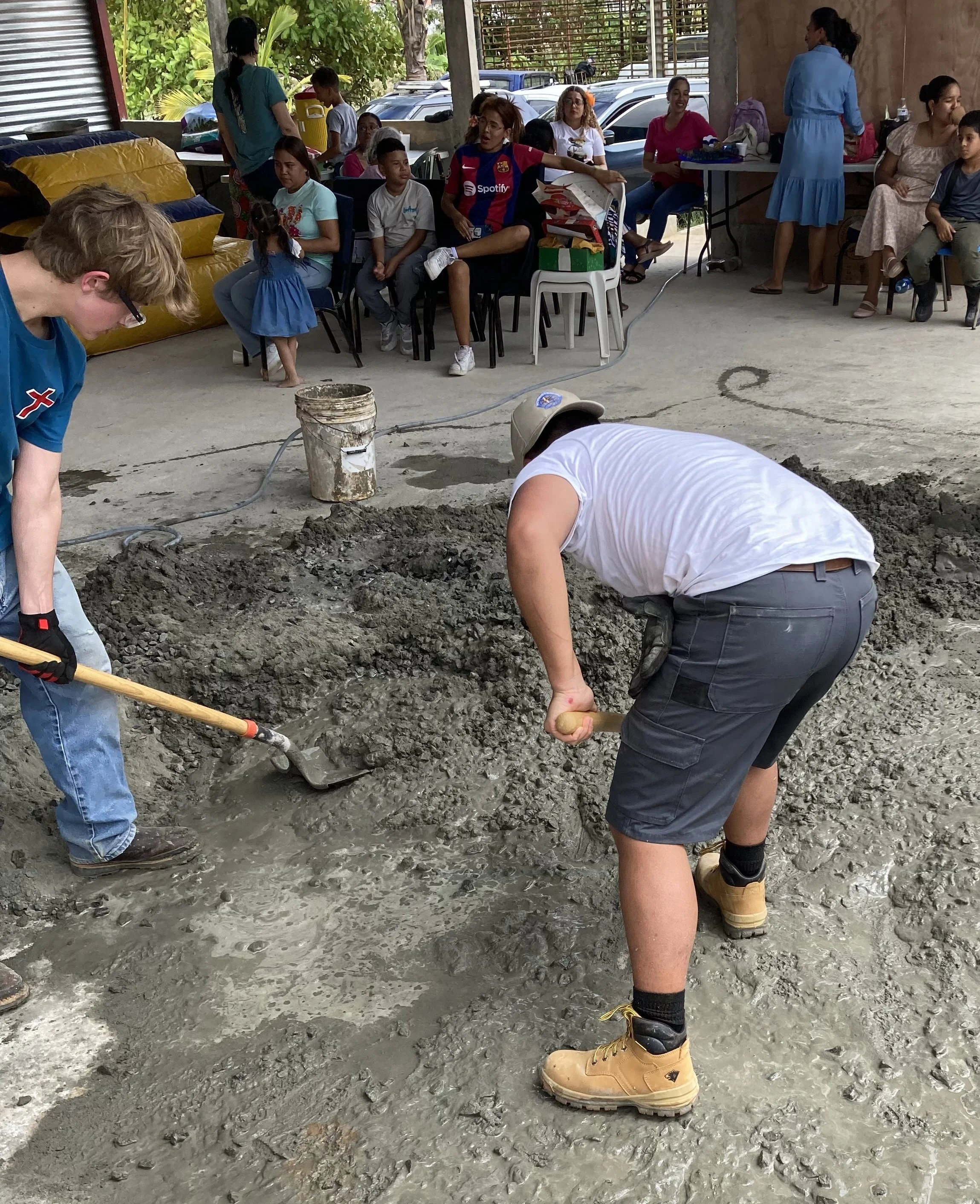 There was a family atmosphere present between us all. We started carrying bags of concrete and sand, and poured them into a big pile. We then shoveled that into two separate piles then back into one. We brought out rocks and dumped those on the circle of concrete mix. Then with the shovels, we made a small mote around the concrete island and hosed water onto it. Together we all stuck our shovels in the middle, and mixed for nearly an hour. After the pile had been depleted, we repeated the process. This was the predominant work for the next three days, and nobody was without a task or a sore back.