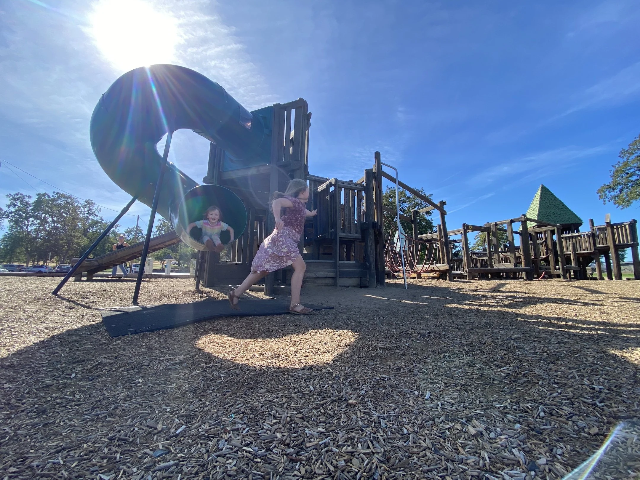The Dalles, Ore., Sept. 20, 2024 — Maisy Smith, 5, of The Dalles, lands on her feet to chase after her sister Audrey, 9, this morning at Tree Top Play Park at Sorosis Park.