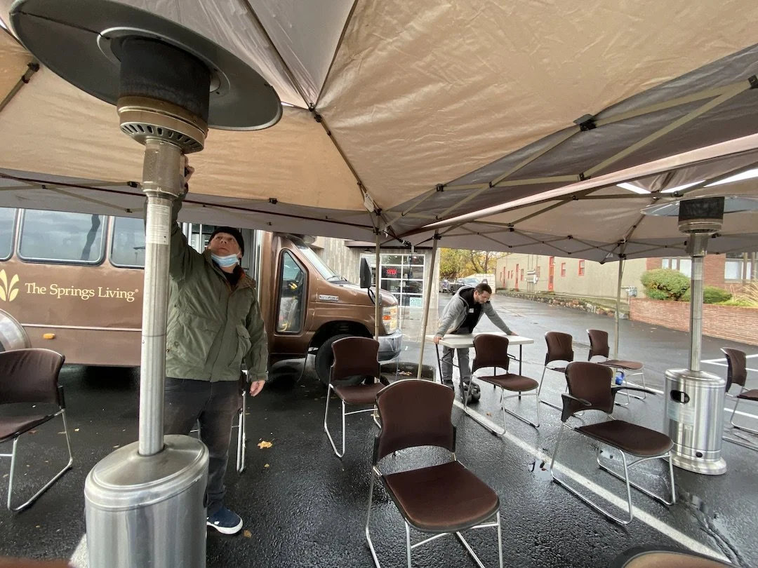 The Springs Maintenance Man Brian Brown gets the heat started for residents who will flock to the Gary Denney Floor Covering parking lot on west Sixth Street for The Dalles Veterans Day Parade. Tom Akre, who usually provides transportation helped with chairs and tables. The two can now officially add parade duty to their resumes.