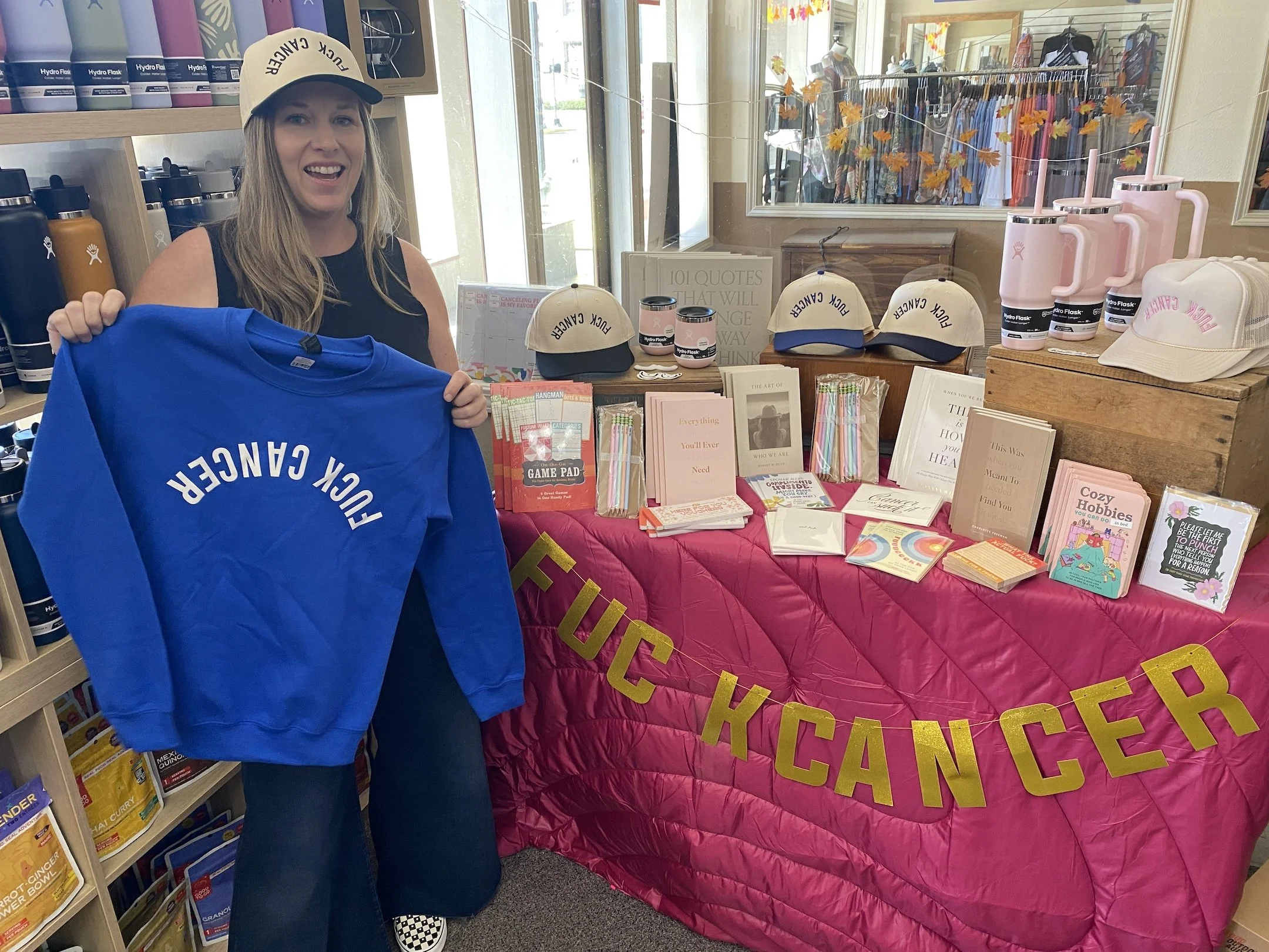 Allison Turner at Skookum Outfitters shows off some of her cancer fighting merch that she will have tonight for First Friday as merchants “Think Pink” for cancer awareness. Turner’s own life has been impacted by the disease as she was recently diagnosed with colon cancer. And she’s fighting back.