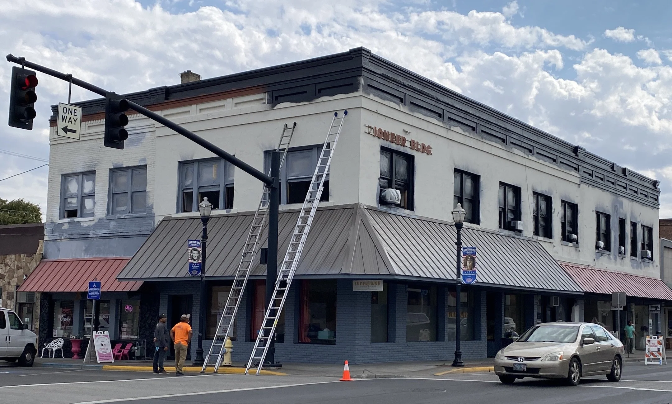 The Dalles, Ore., Aug. 22, 2024 — Some fine ladder work was afoot downtown The Dalles today as the Pioneer Building is getting a monochromatic makeover.