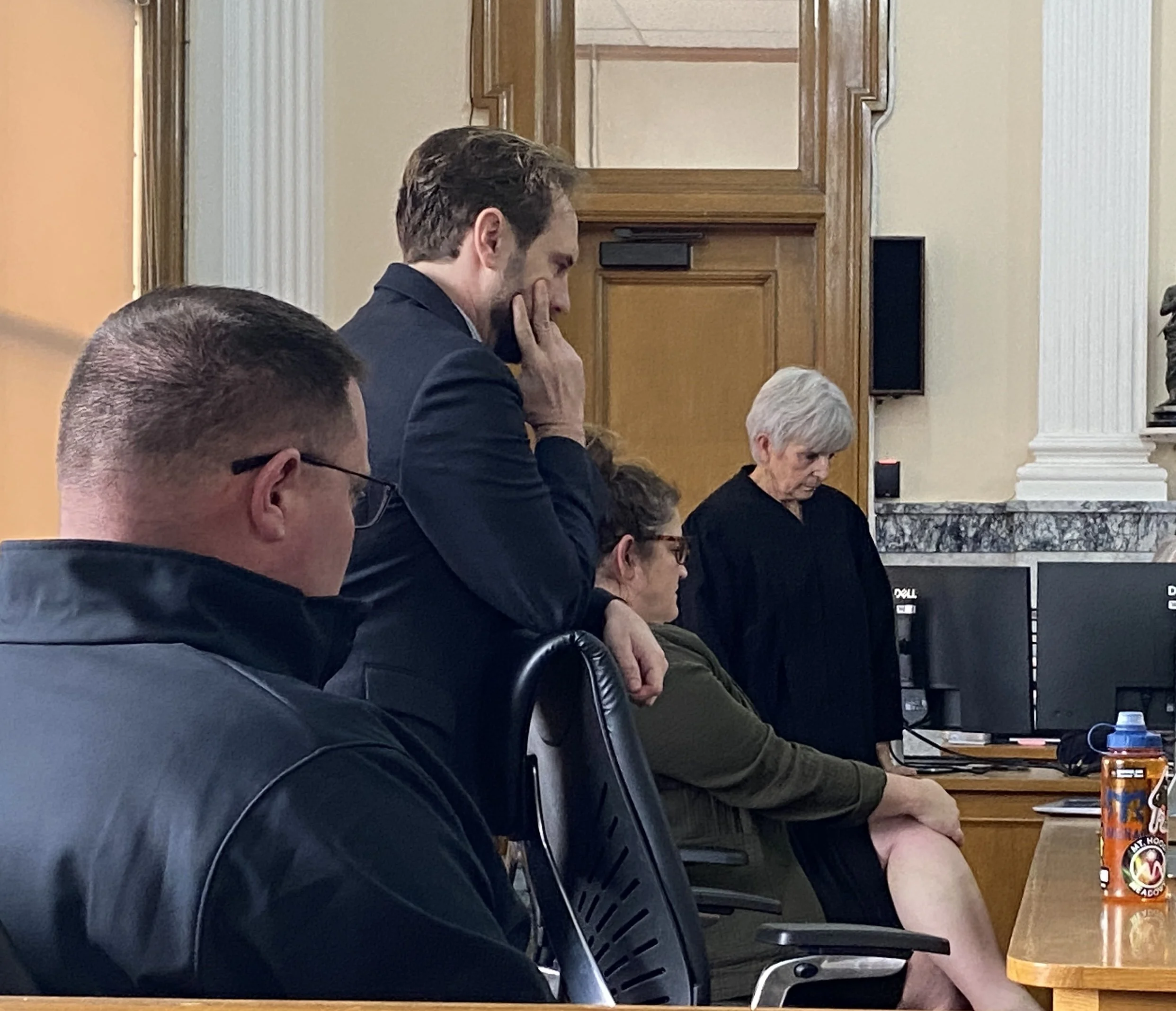 Judge Stauffer, Wasco County DA Kara Davis, Special Prosecutor Matt Ellis and Sgt. Austin Ell listen as a jail phone call between Jason McCollum and a friend is played in the courtroom.