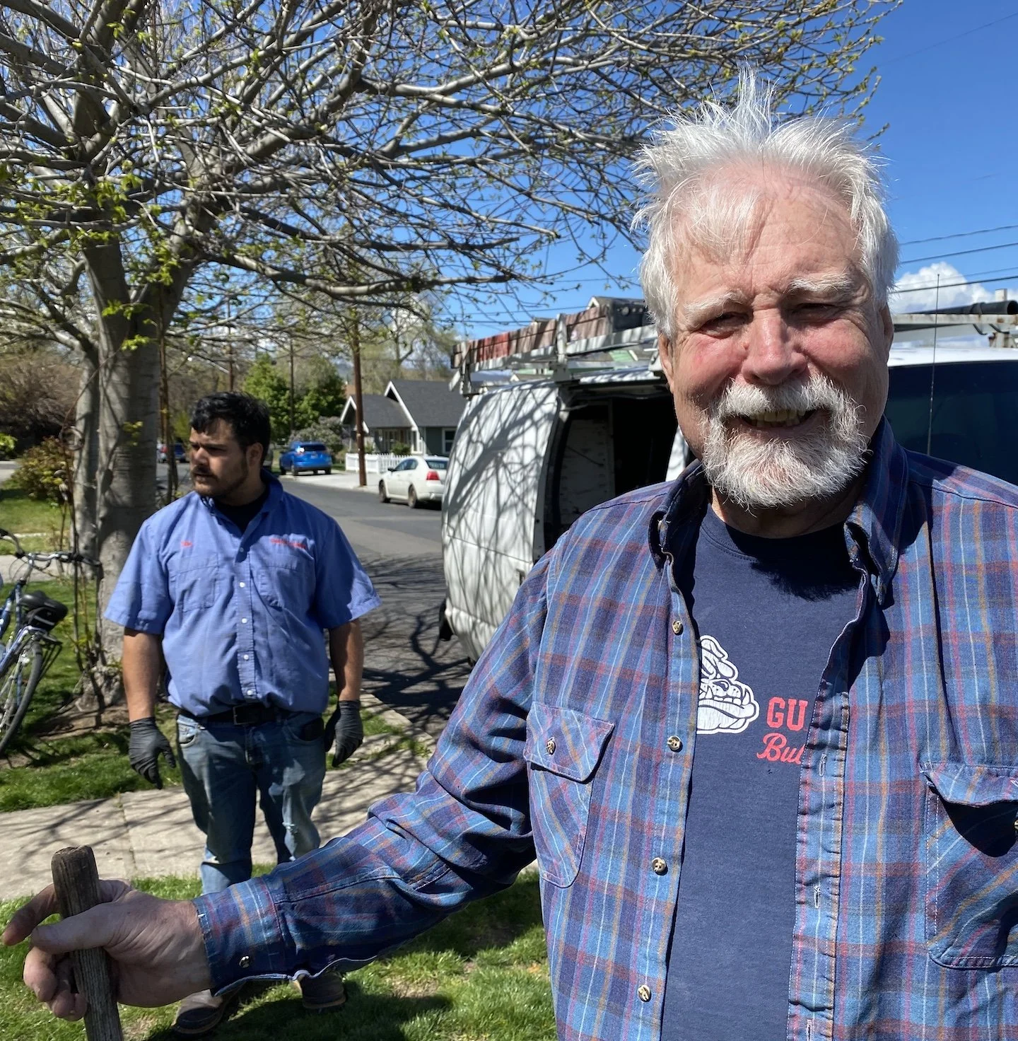 Just up the street, Tito Garcia, Jim Rutherford and John Thornton were probing the ground outside a home on west 8th Street in The Dalles. Uh, oh. They were looking for a sewer clean-out. Oh well, still sunny and gorgeous on a Friday with quitting time within three hours … maybe. They were upbeat.