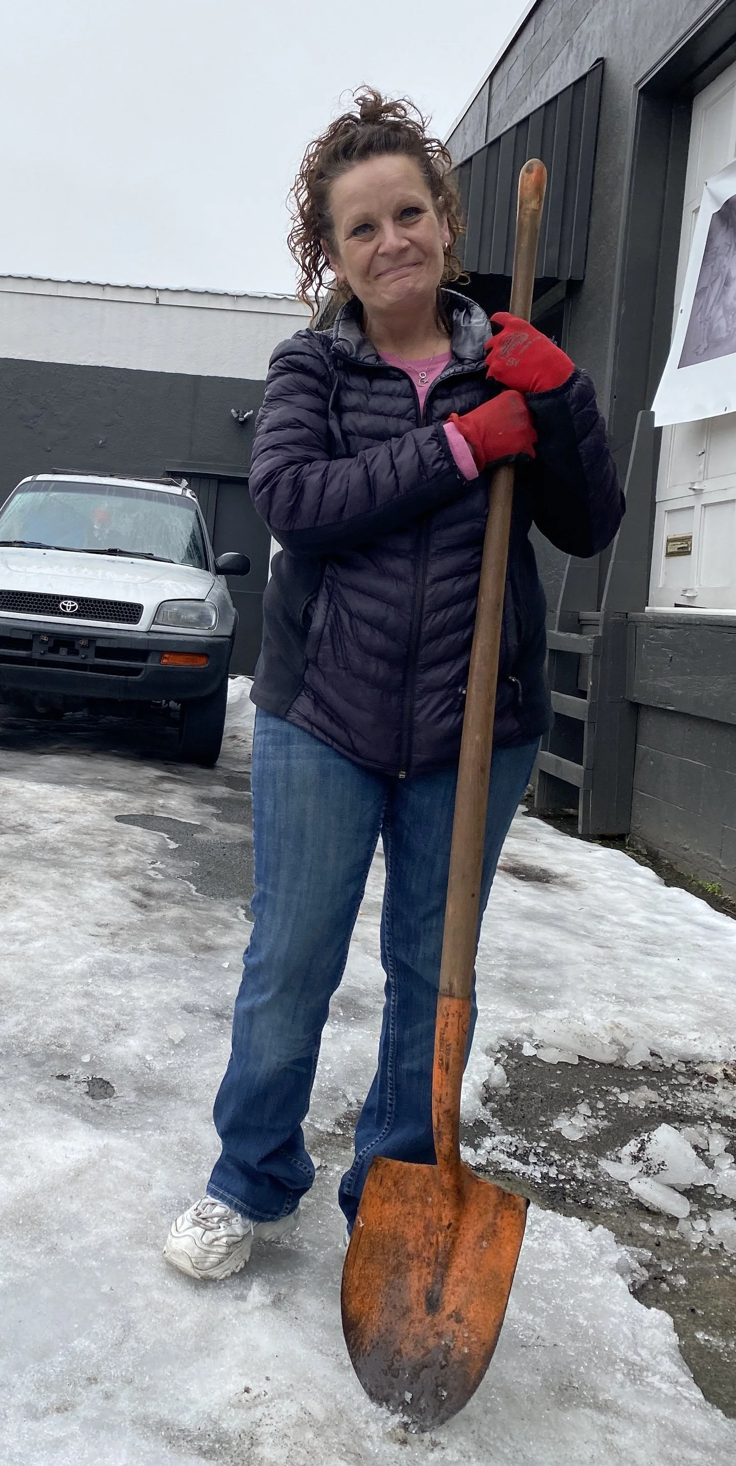 We found Joli working hard to break up the ice at this parking lot on West Sixth Street.