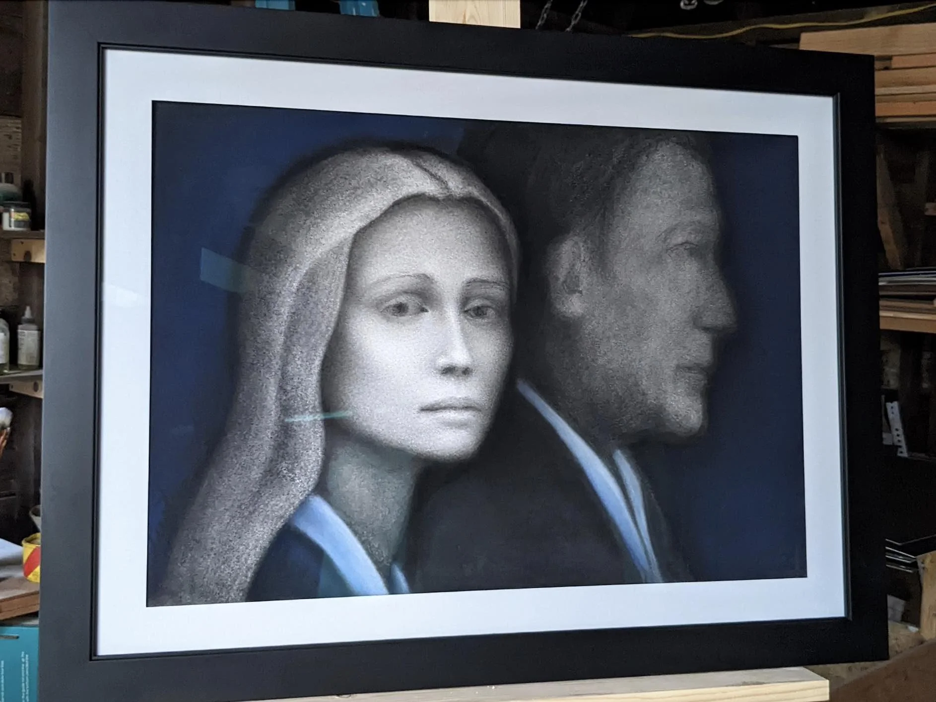 Craig Luster at home in his studio. To his left is an unfinished sculpture, and to his right is a finished pastel drawing titled “The Revelation of Saint Teresa” which depicts St. Teresa of Ávila, who believed she had been visited by Jesus in invisible bodily form. She was also famous for having experienced a vision of a Seraph angel who thrust a flaming spear into her heart and set her on fire with a love of God so spiritually painful and sweet that she never wished to be rid of it. Photo Credit: Cole Goodwin