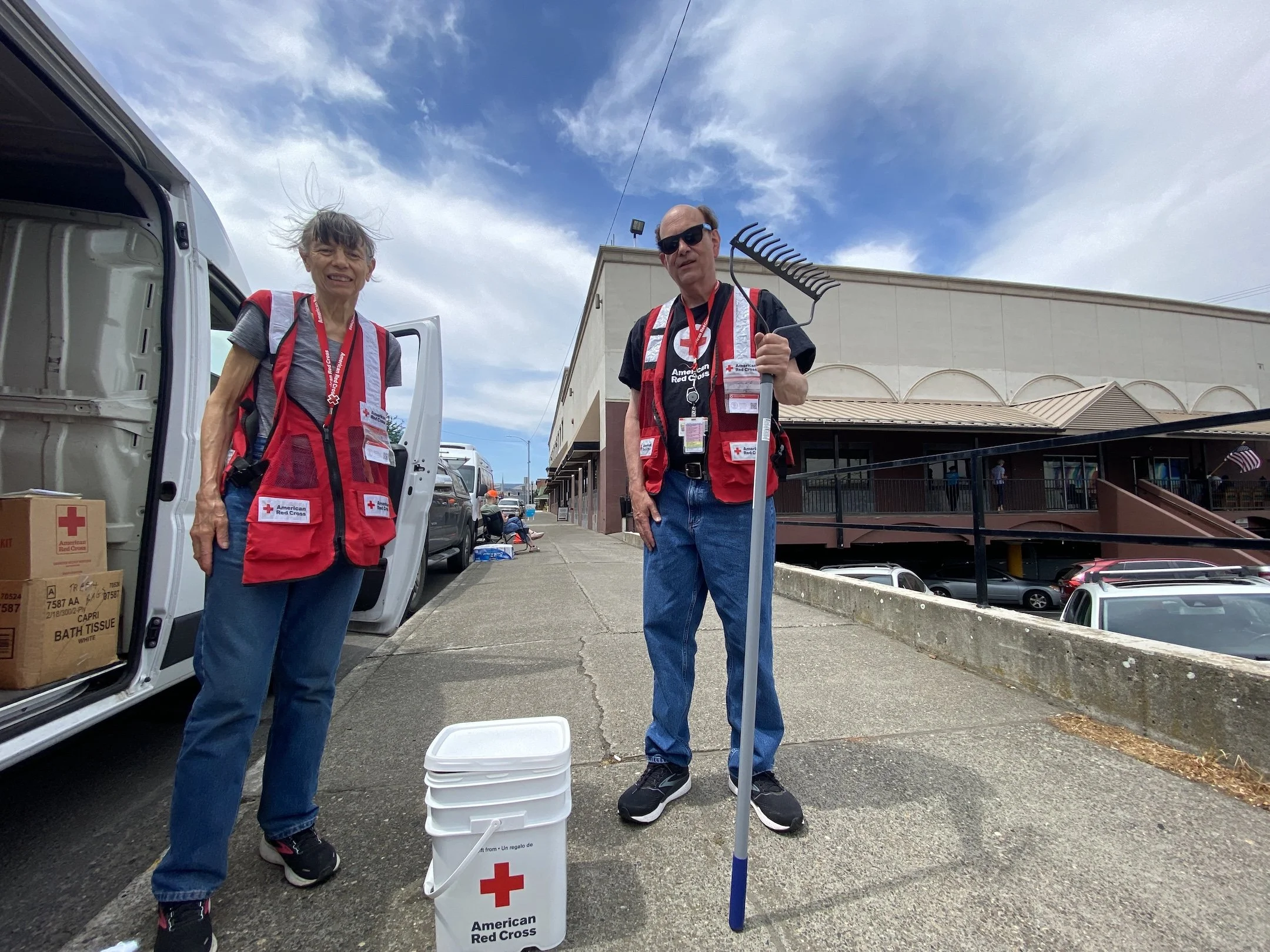 Disaster Relief Volunteers with The American Red Cross were handing out tools and supplies to help victims of the Rowena Fire. They offered rakes for culling through ashes and buckets with basic supplies such as trash bags, gloves. Tyvek suits were also available.
