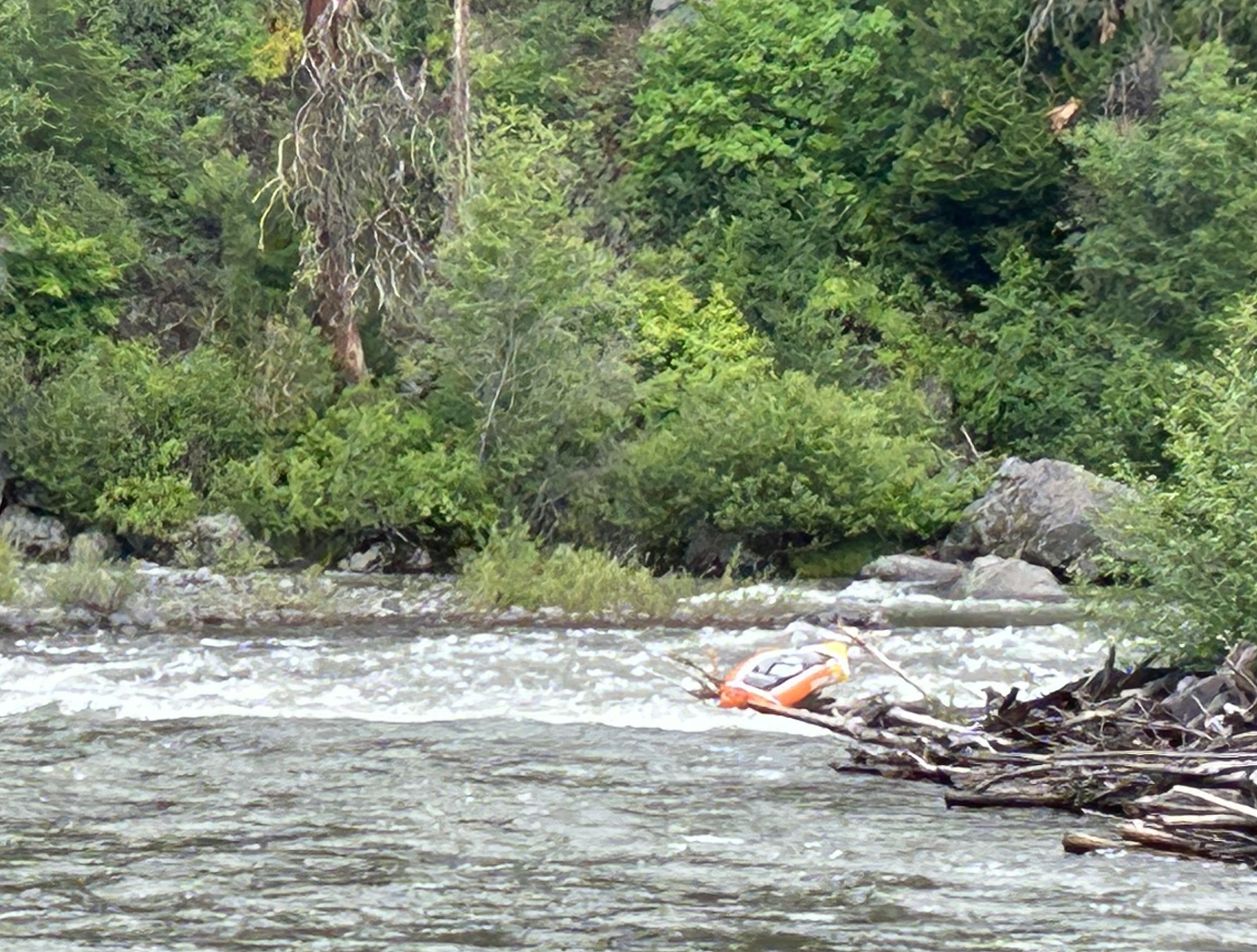 The two-person inflatable kayak was seen resting on top of wood debris on the right side of the river, near the Klickitat Fish Hatchery on June 9, nearly a week after a 29-year-old woman fell out of the boat and went missing. Officials called off the search last week. Photo by Justin Brimer