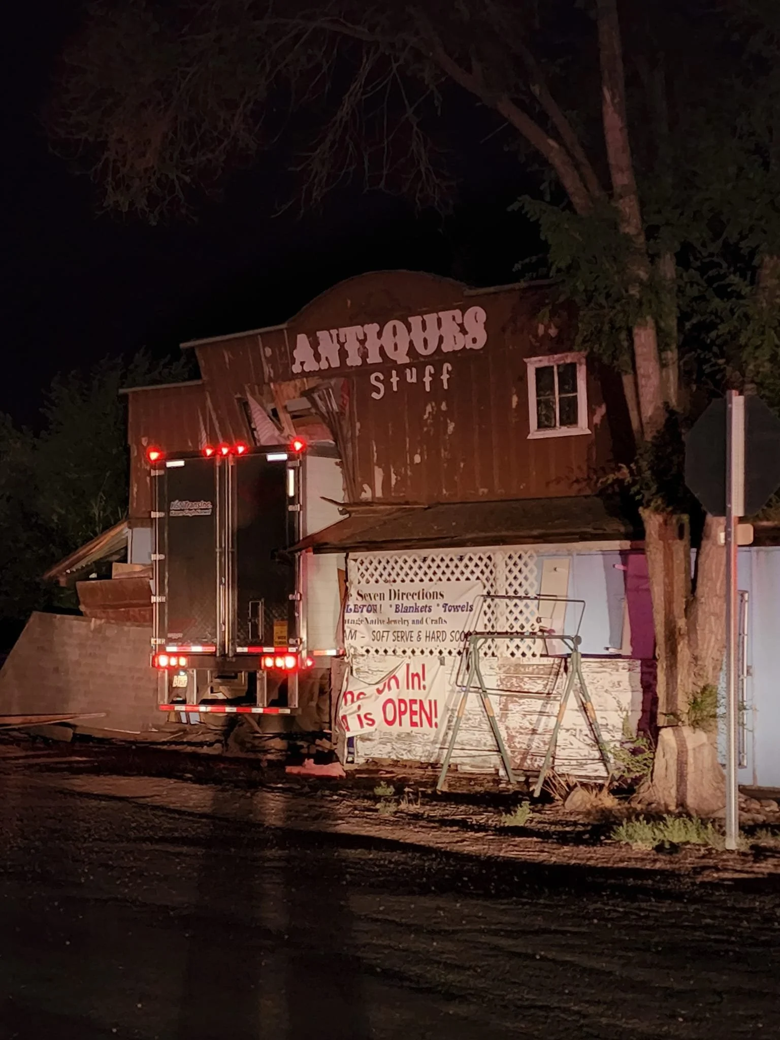 The proprietors of the Ice Cream Shop in Shaniko were shaken from their homes on Sunday night, Aug. 21, at 11:30 p.m. when a northbound semi-truck on Highway 97 ran off the highway and drove his entire truck into the restaurant called The 7 Directions.
