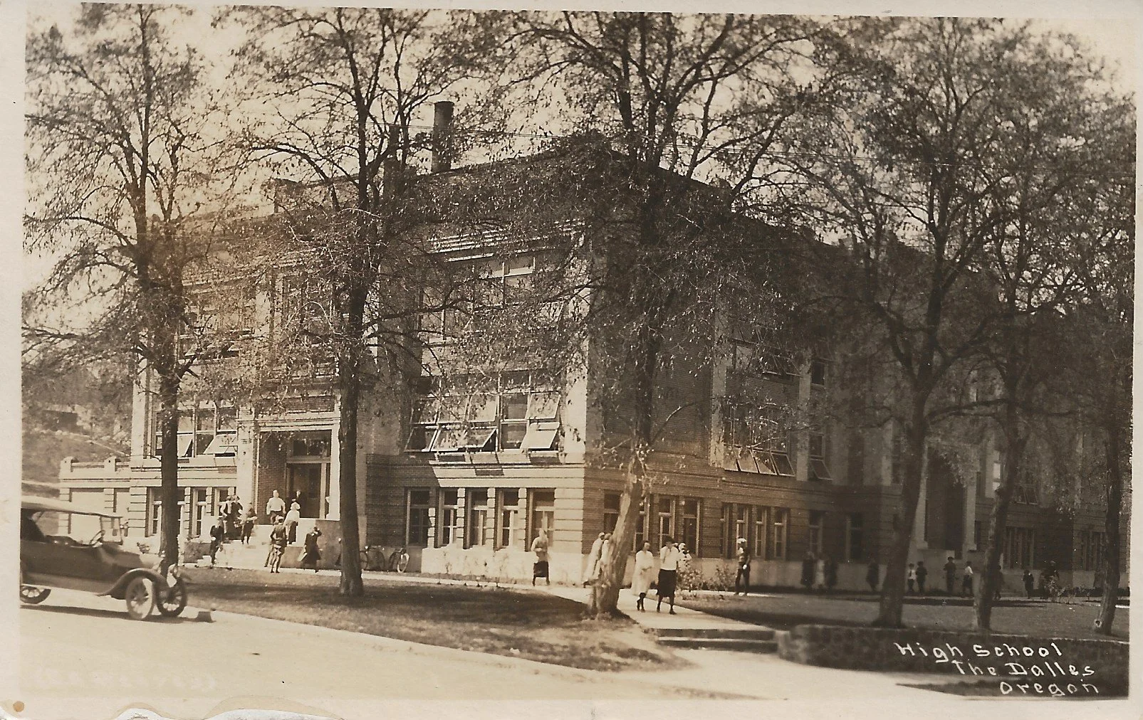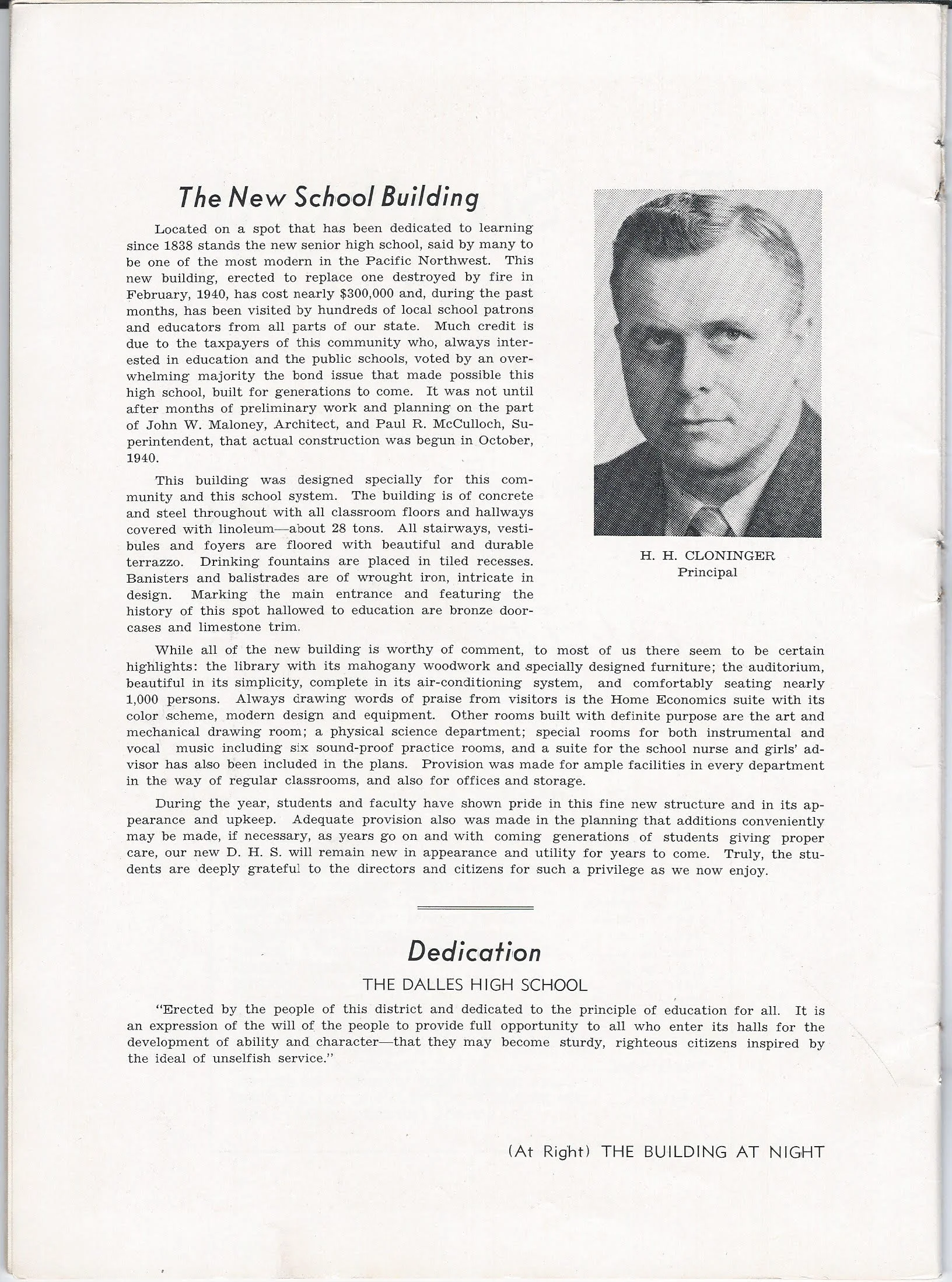 Oh, and Paul Anthony Menegat was Principal of The Dalles High School from 1937-1941, so he should have been Principal when the new building was dedicated in 1941. An interesting side note here is that he went on to become a professor at Oregon State College (now OSU) and Superintendent of Schools in Spain from July 1955 until after 1957. In fact, he mentions that TDHS burned in 1939 in a dissertation that he wrote in 1953 on the history of trade and industrial education in Oregon. Even though some articles I found puts the fire in 1940, I am going with what Dr. Menegat says, since he was there. Dr. Menegat passed away in 1976 at the age of 75 in Forest Grove, Oregon.”