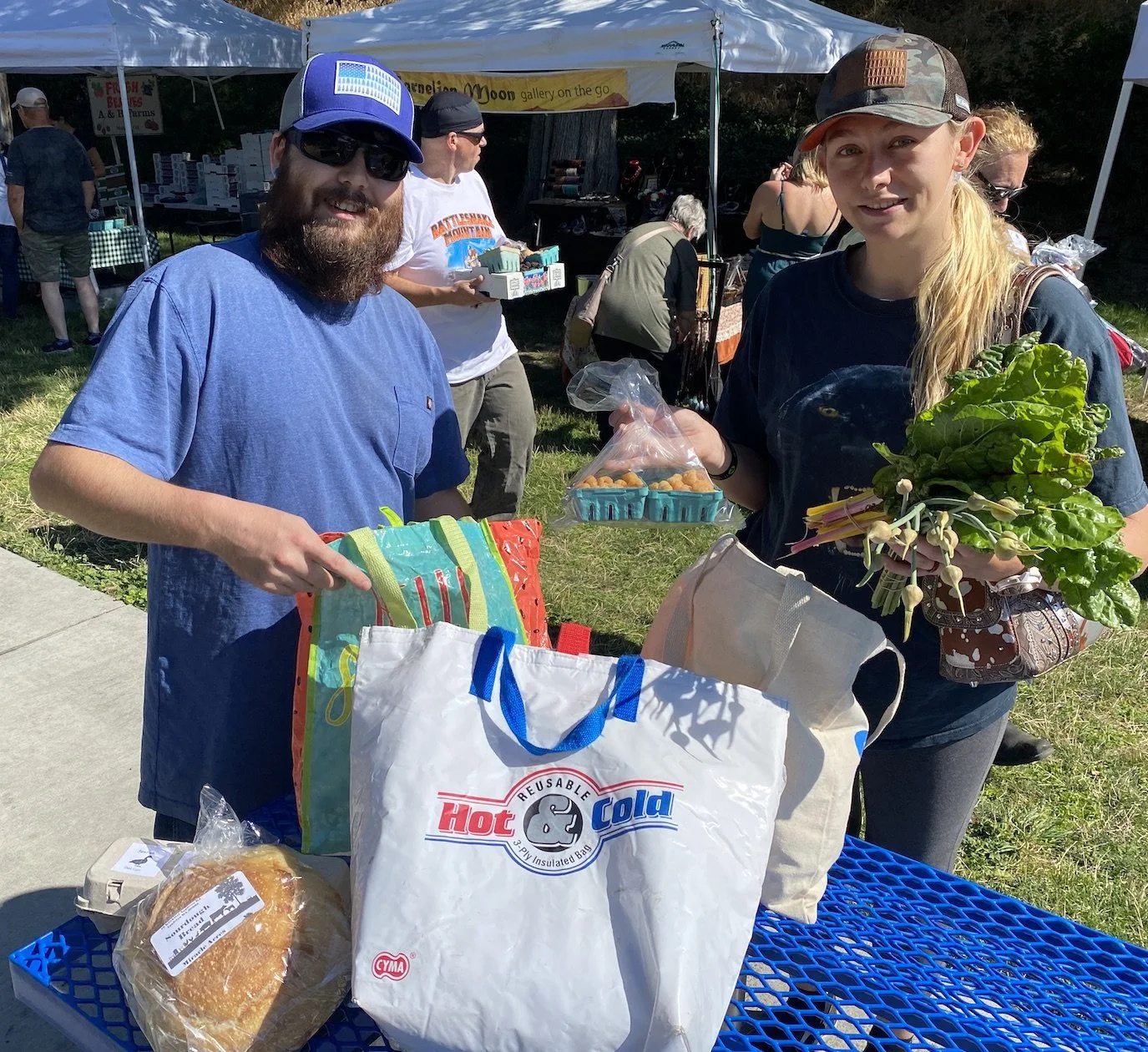 Bringing in the bounty - Terrus Pimley and Dawna Pruit of The Dalles filled their reusable bags with some awesome selections including duck eggs, sourdough bread, salmon berries and rainbow chard. Terrus said they were headed to the Living Springs next to procure some lamb and other meats. We’re down with that you grillin’ gourmand!