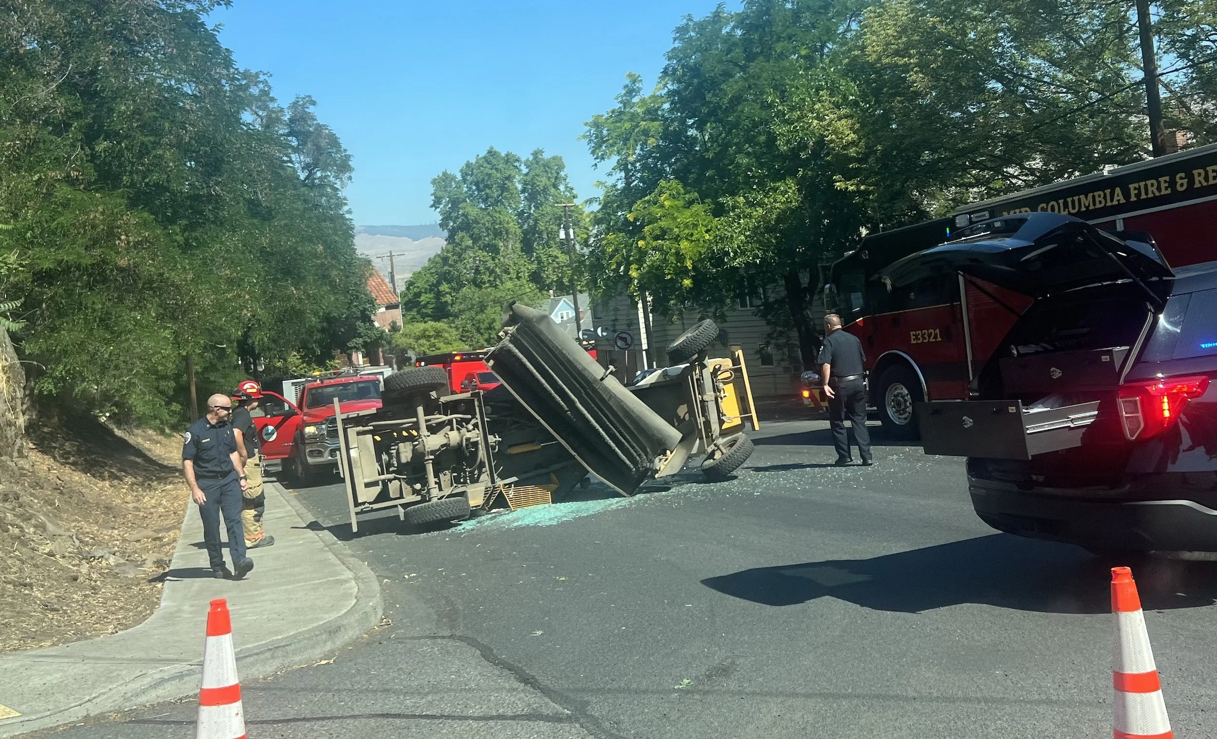 Sweep Master Rolls Down Steep Road, flips in The Dalles; Driver Hospitalized