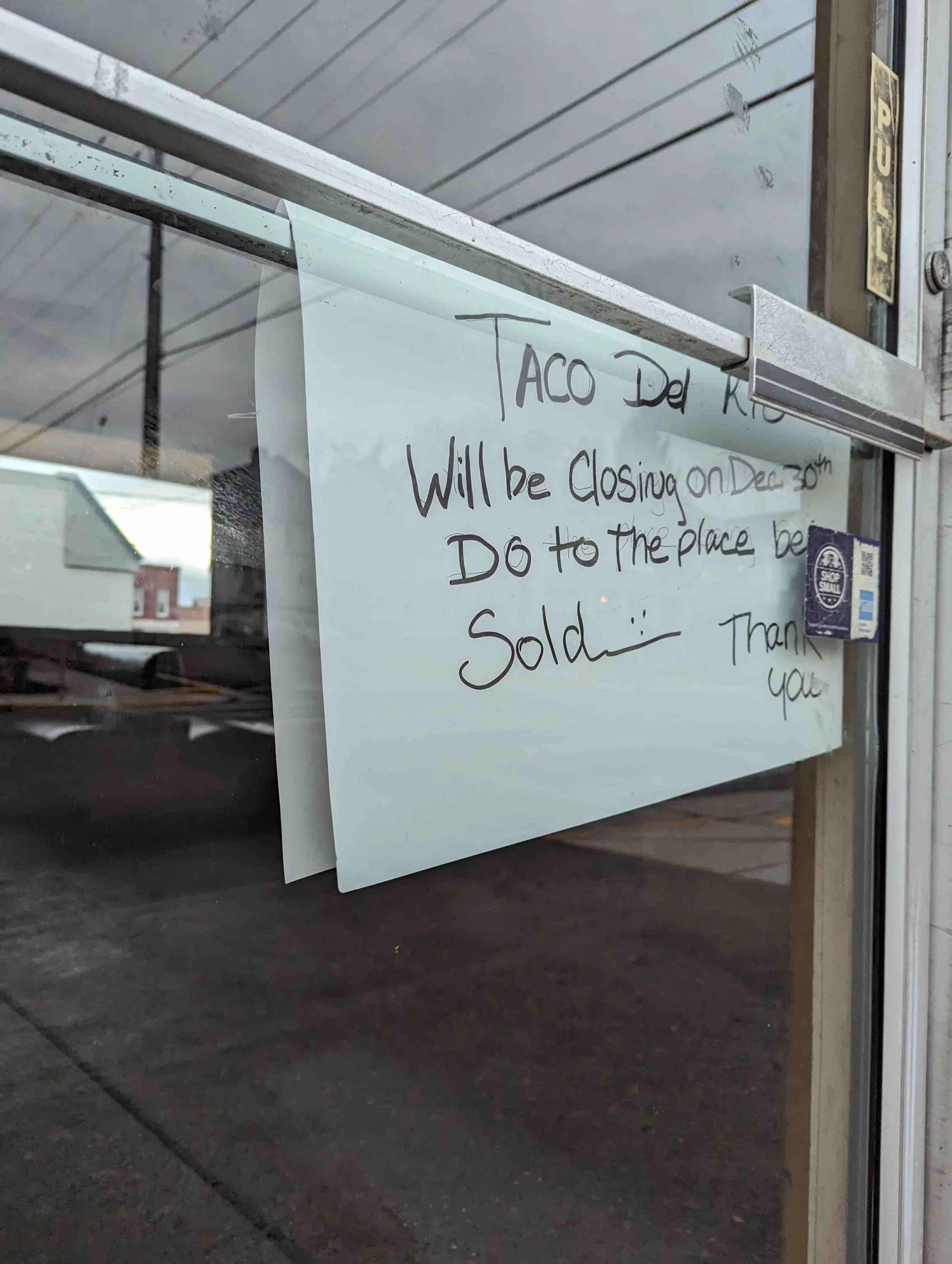 A sign on the door of Tacos Del Rio.