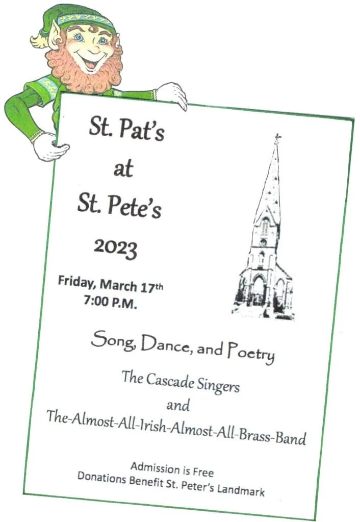 The Dalles Cascade Singers and The-Almost-All-Irish-Almost-All-Brass-Band present the annual St. Patrick’s Day fundraiser at St. Peter’s Landmark. This annual event collects donations to benefit the historic St. Peter’s Landmark located at the corner of Lincoln and 3rd Streets. Official festivities commence Friday, March 17th, at 7:00 P.M.