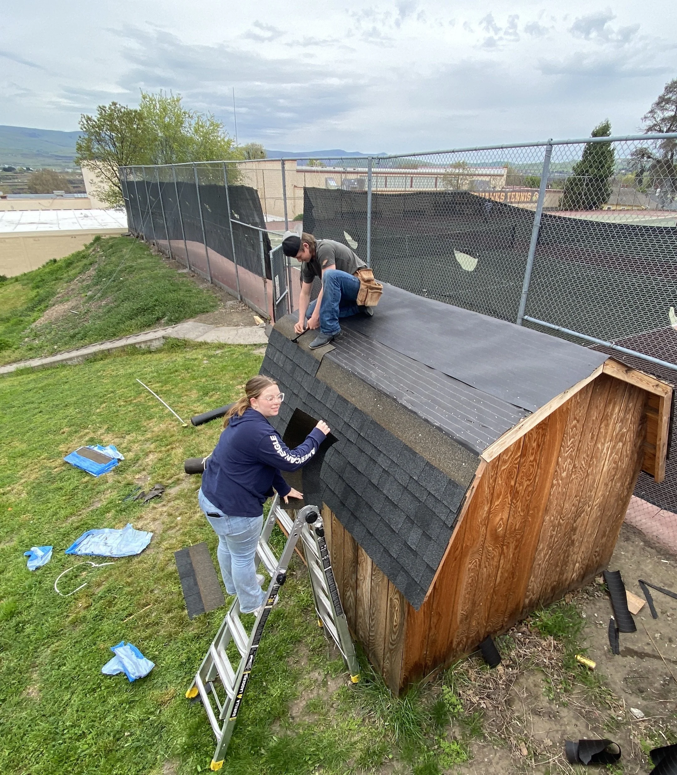 TDHS students Daysha Baker, junior, and Josh Brakenbury, sophomore, work together to install new roofing on the tennis storage building on Friday, April 13.