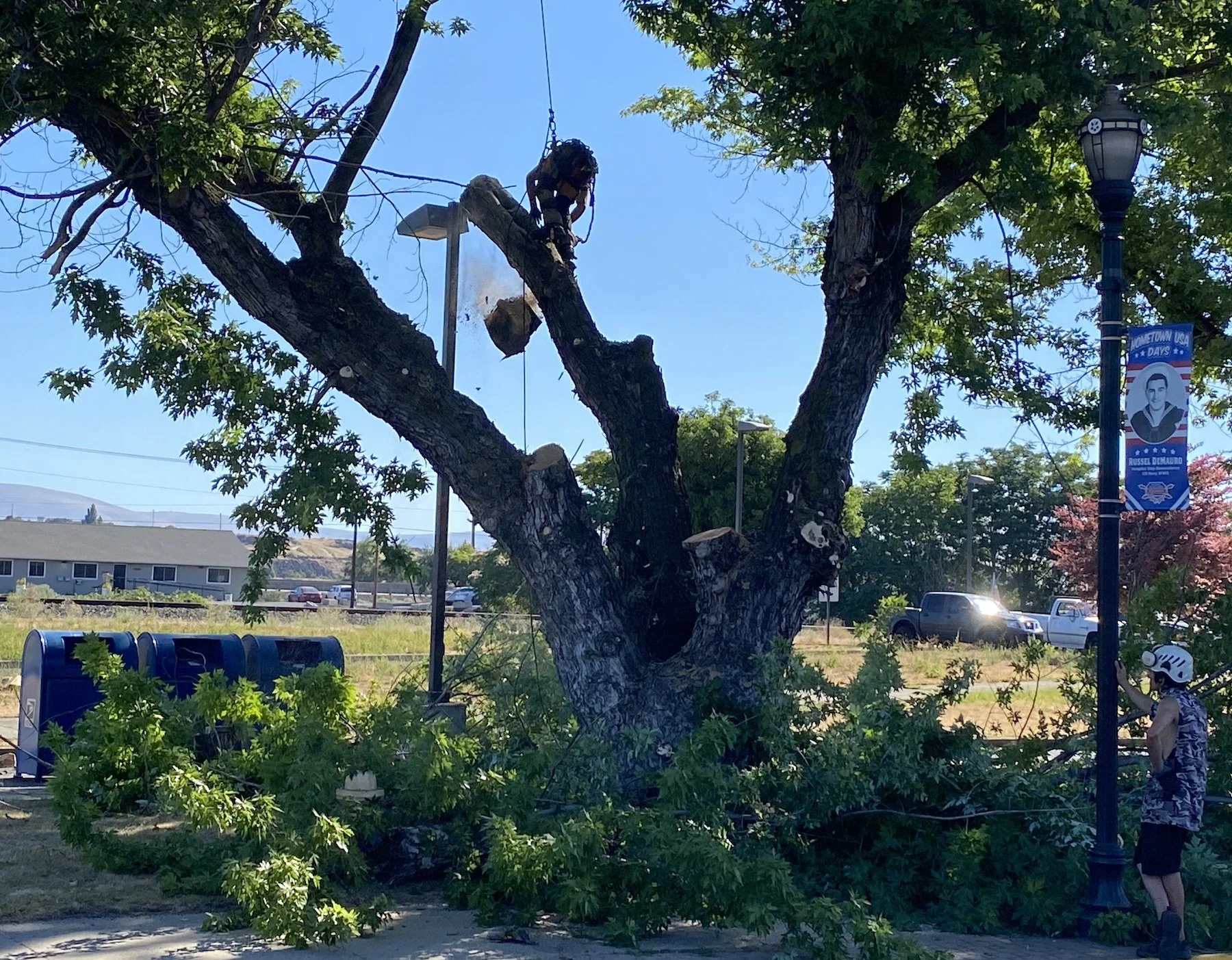 Let The Holidays Begin - Northern Wasco People’s Utility District crews were out on Monday, Nov. 22, attaching trees to light poles in downtown The Dalles. We’re in deep now. D21 students have the week off and Dufur finishes off this afternoon. That leaves a lot of time to catch that turkey before Thursday. And good news, forecasters are calling for partially sunny skies the next two days.