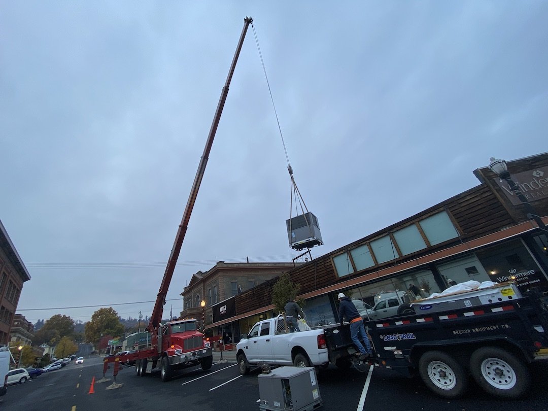 Honald Crane took part of this heating, ventilation and air conditioning system to the air on Tuesday morning, Nov. 2 at Court Street downtown The Dalles. The company was working in concert with Oregon Equipment to install the new system on the building that houses Columbia River Affordable Portables, Mary’s A-Tax and Windermere Real Estate.