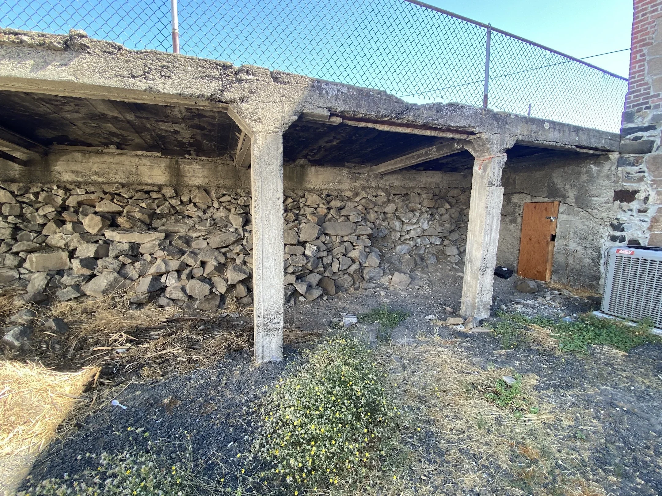 Example of stacked rock walls and failing sidewalks on First Street - this photo was taken next to the near the Baldwin Saloon at First and Court Streets.