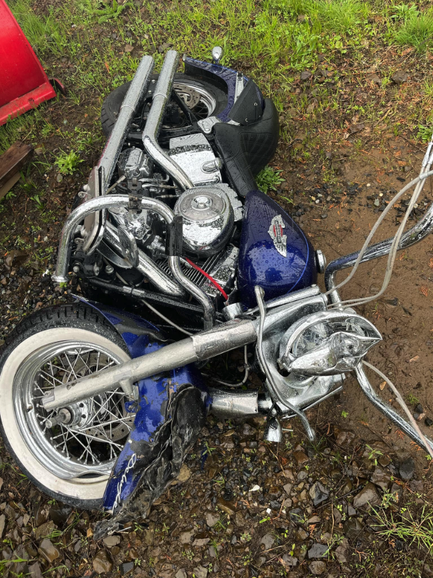 Bolton’s Harley sustained heavy damage to the front end in the crash on Highway 35 near the Sawtooth Roadhouse.