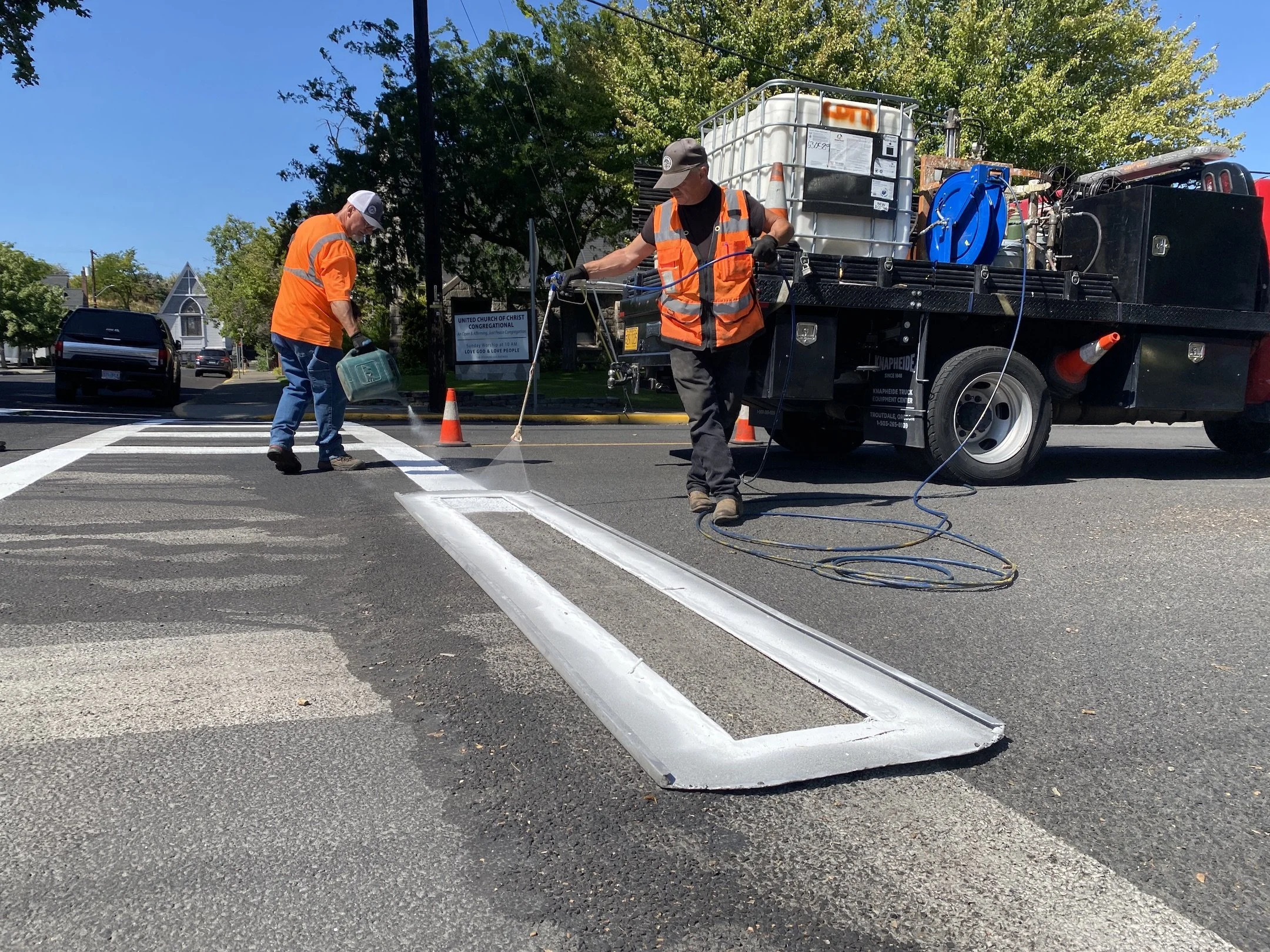The Dalles, Ore., Aug. 27, 2024 — Bruce Borders uses his magic wand to brighten up a crosswalk at the corner of Fifth and Court streets in The Dalles on Tuesday, as he and fellow City of The Dalles Public Works employee Russ Duncan worked around the downtown core brightening up striping in the area.