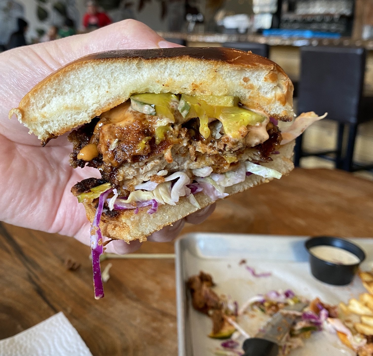 Purple slaw meet butter pickle. Crunchy chicken you best be fueled on rocket sauce. Lift off.