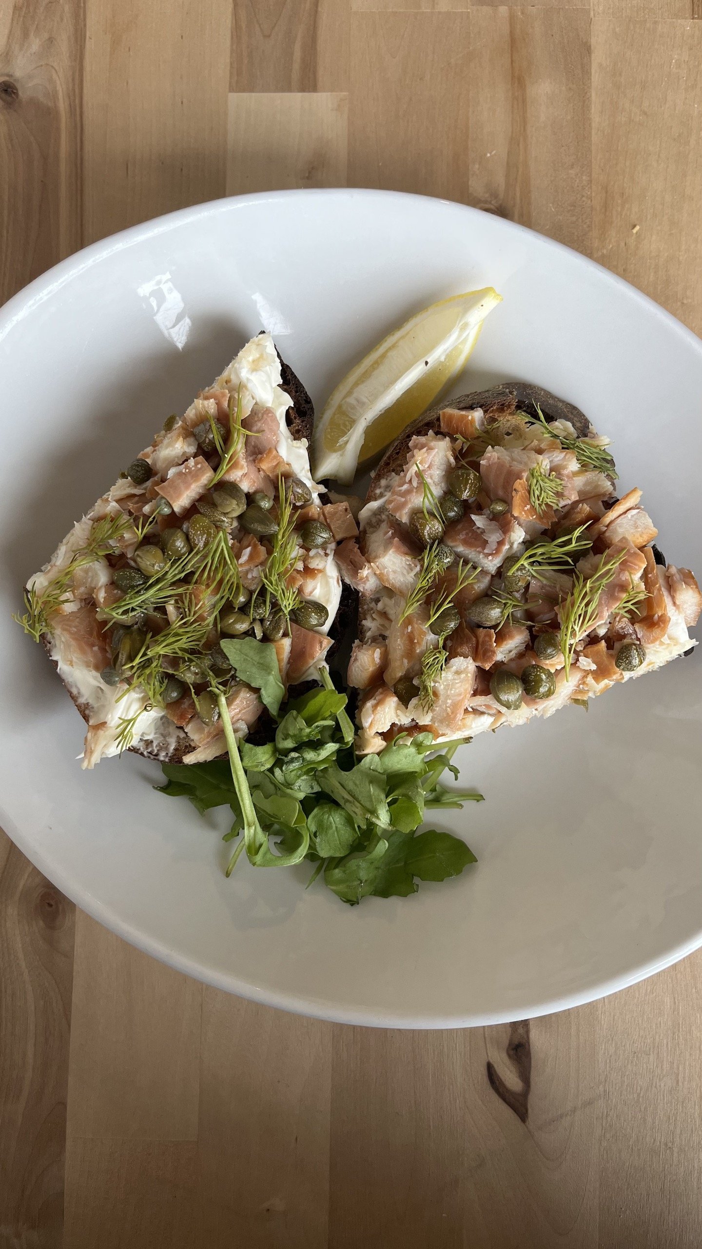 It starts with crusty homemade sourdough bread and is then topped with a healthy spread of cream cheese, smoked trout, salty capers, sprigs of fresh dill, and it comes with a side of arugula and a lemon wedge. The picture does not lie; this dish is more like a piece of art rather than a piece of toast.