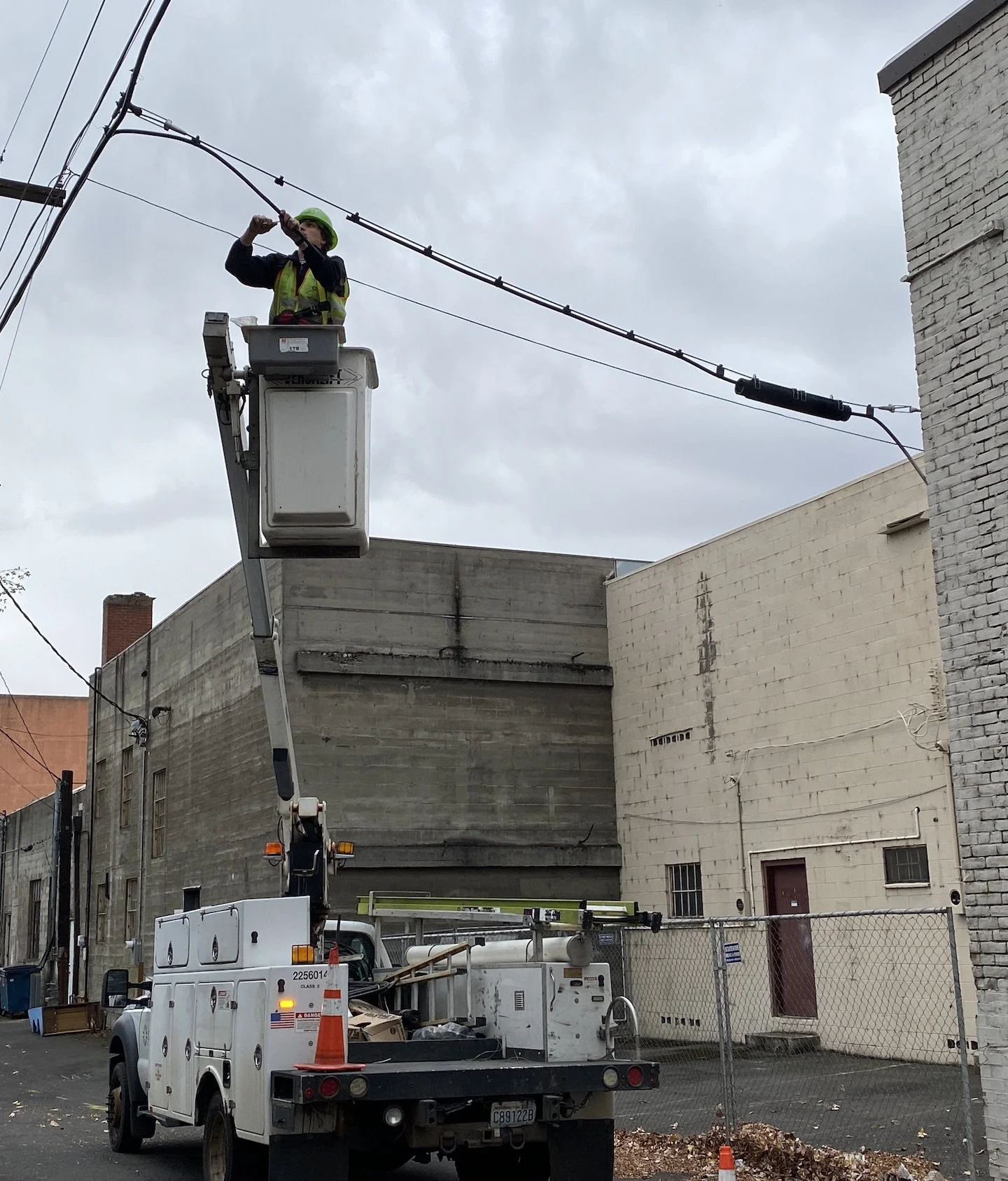 CenturyLink’s Riley works to disconnect phone wires to the Tony’s building on Monday, Oct. 2 in preparation for the demolition.