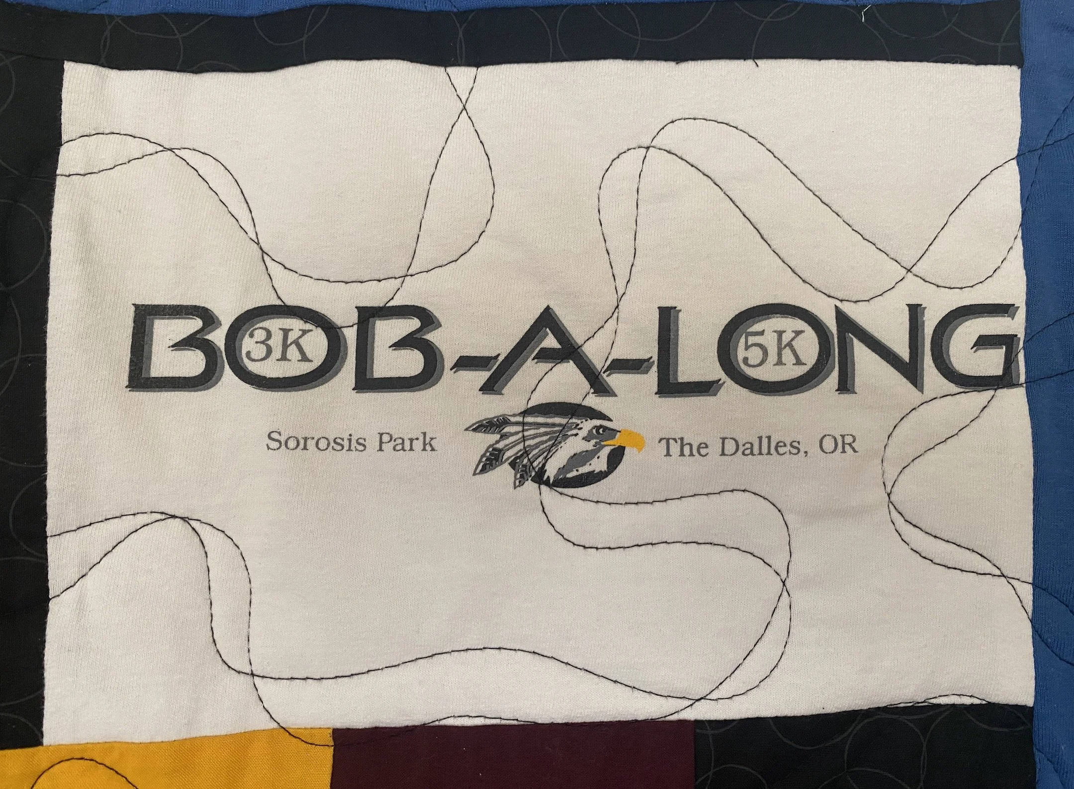 Mary Beth and Bob Thouvenel, along with Cross Country Coach Jill Pearson Bell, stand next to the tapestry of Bob’s 57 years as a cross country coach. The three have put together the “Third and Final Bob-A-Long” run/walk at Sorosis Park on Oct. 5 at 10 a.m. You can register now and guarantee yourself a classic Bob T-shirt! All proceeds benefit The Dalles High School Cross Country Team.