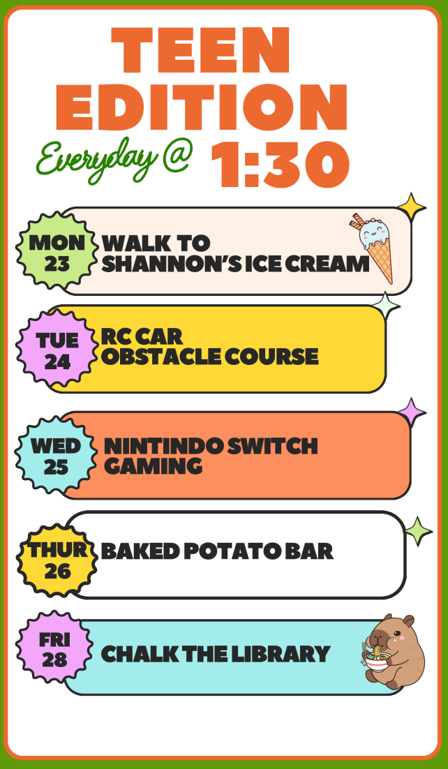 Walk to Shannon’s Ice Cream & City Park, 1:30–3 p.m. The Dalles Public Library. Free. Open to teens. Registration required. Group walks to Shannon’s Ice Cream with a stop at City Park. Permission slip required; contact afeil@thedalles.gov.