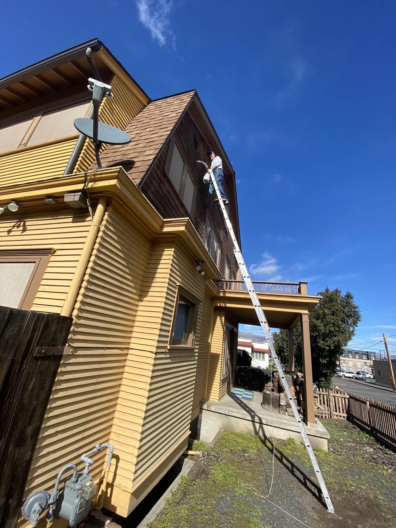 The Dalles, Ore., March 14, 2025 — Chuck Langley took it to the top on Thursday, March 13, to paint a portion of the east side at Columbia River Windrider Inn at at 200 W. Forth Street in The Dalles.