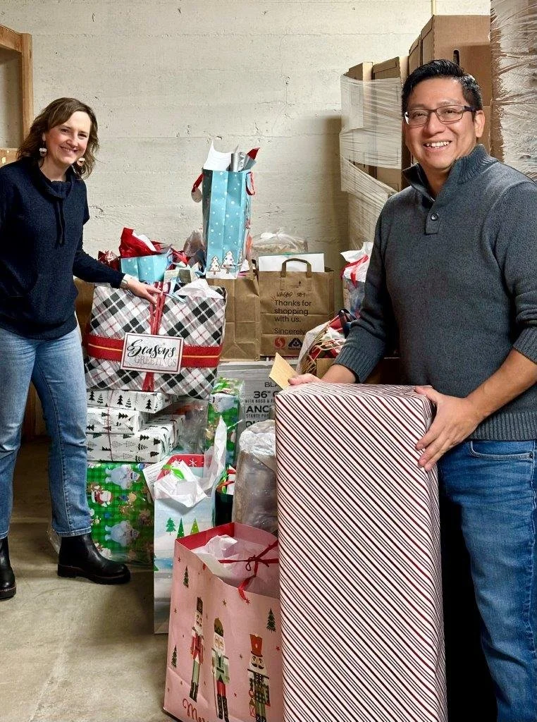 Jennifer King of Insitu brings employees gifts for the Tree of Joy to the Bingen Food Bank and hands them off to Juan Reyes, WAGAP associate director.