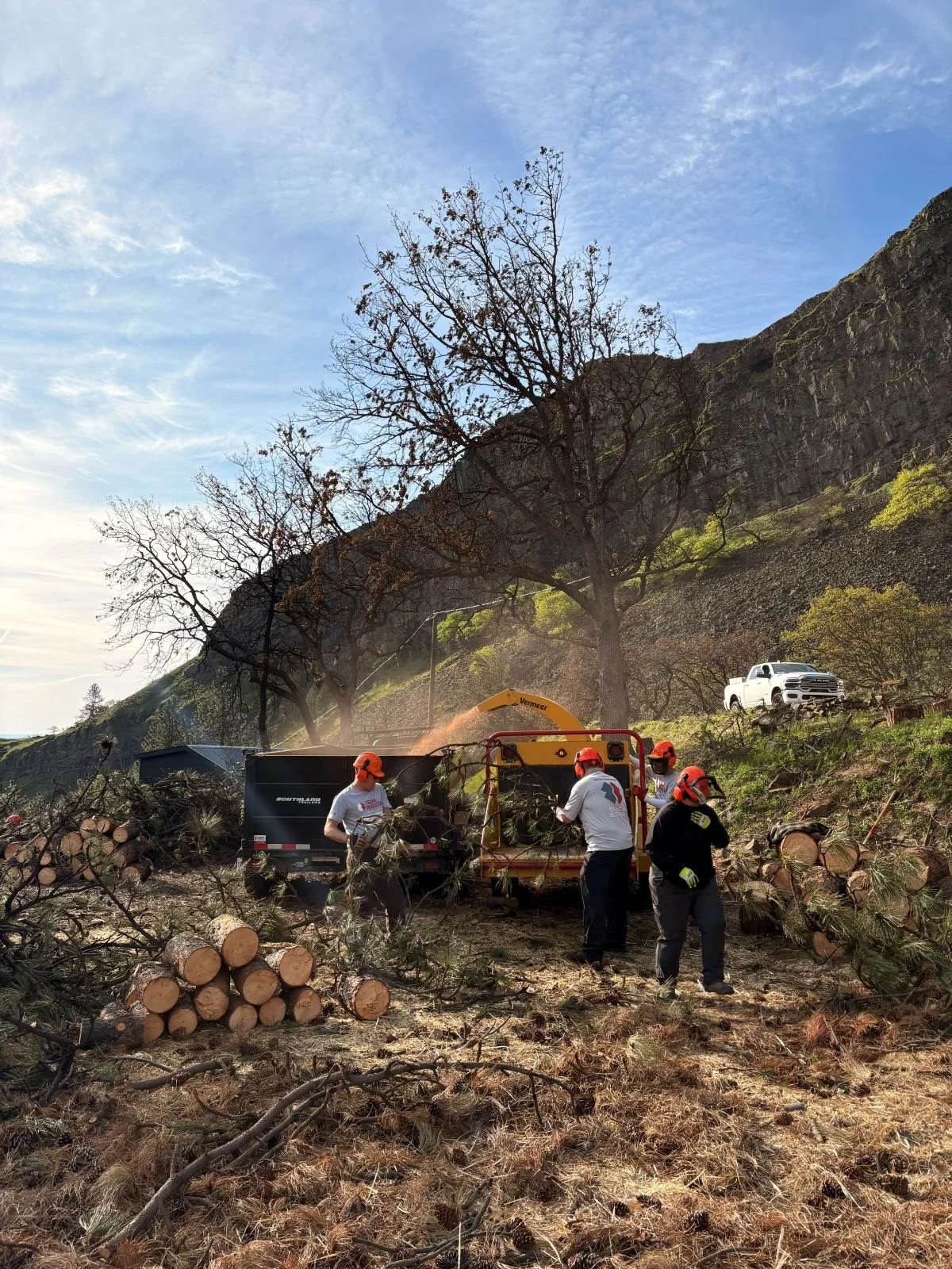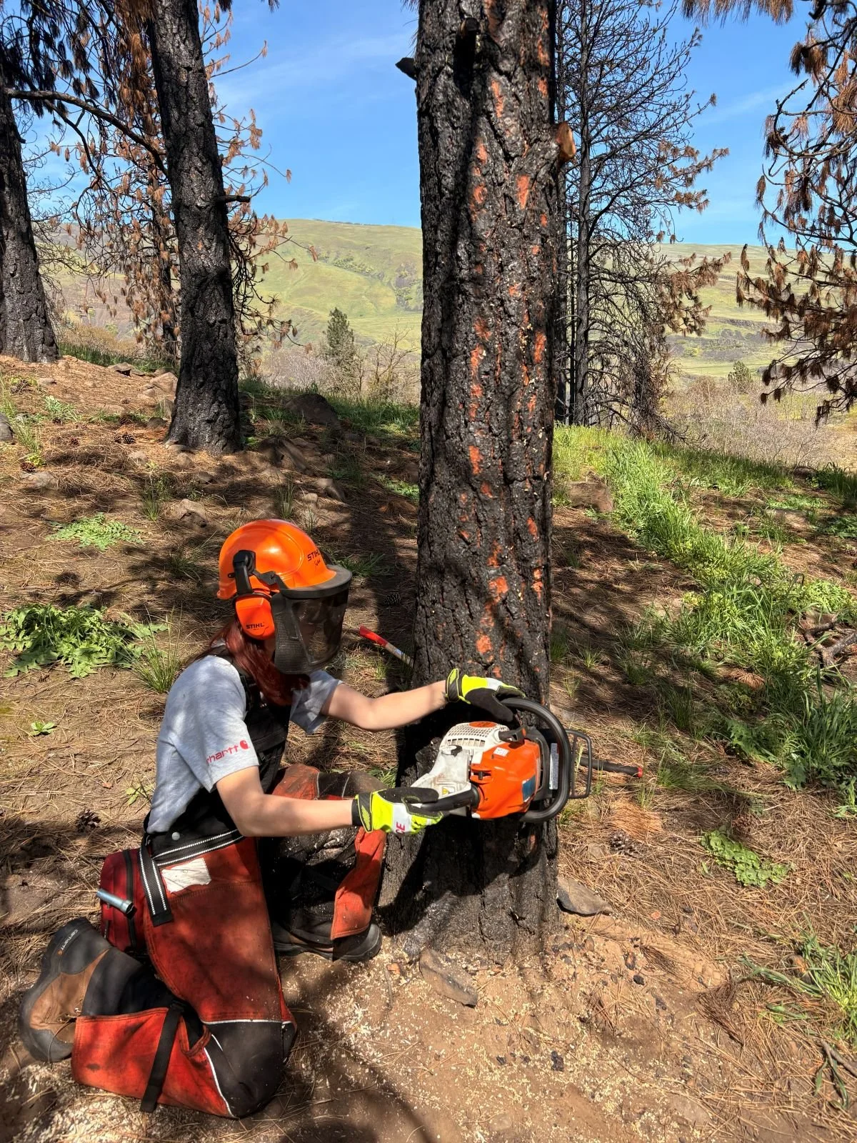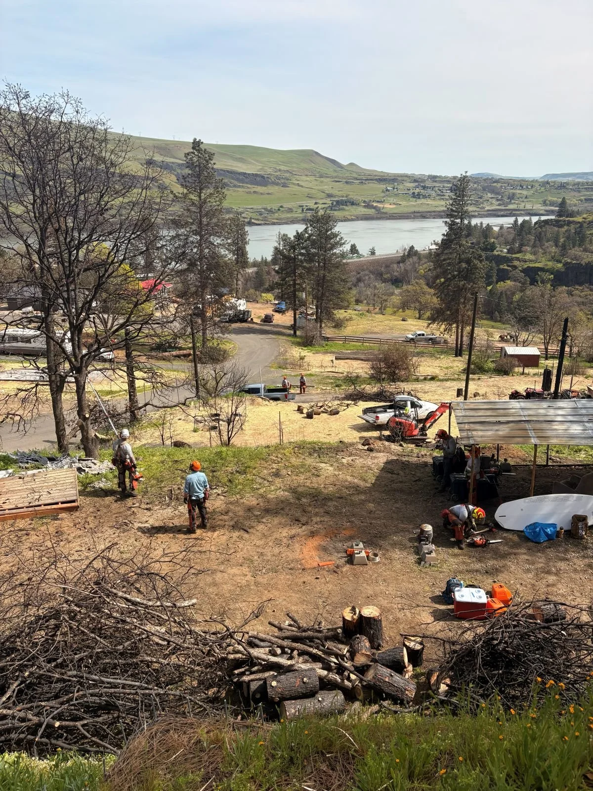 Dozens of Team Rubicon volunteers—known as Greyshirts—are in The Dalles at the request of the Village of Rowena, a non-profit formed by homeowners affected by the fire. The recovery has been stymied by the dead and dying trees left behind by the fire, preventing residents from safely rebuilding their homes; Team Rubicon volunteer Greyshirts are addressing that critical need.