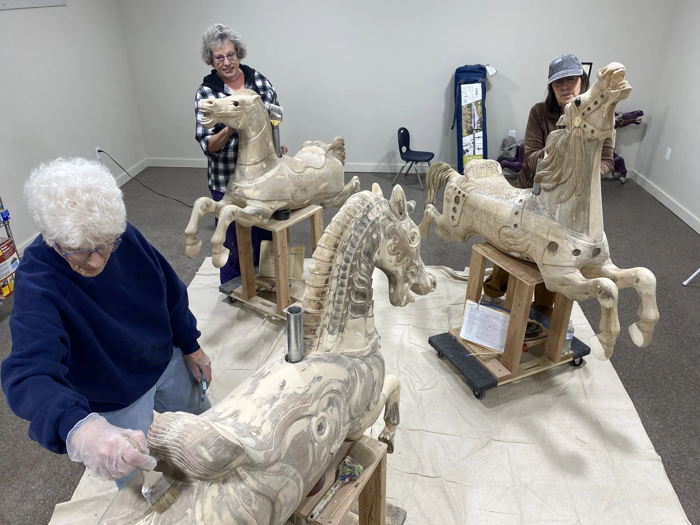 Restoration is being done in groups of four horses at a time — often referred to as “families” — based on their placement and design on the carousel. More than a dozen horses are currently in various stages of restoration, with volunteers specializing in woodworking, painting, surface preparation and documentation.