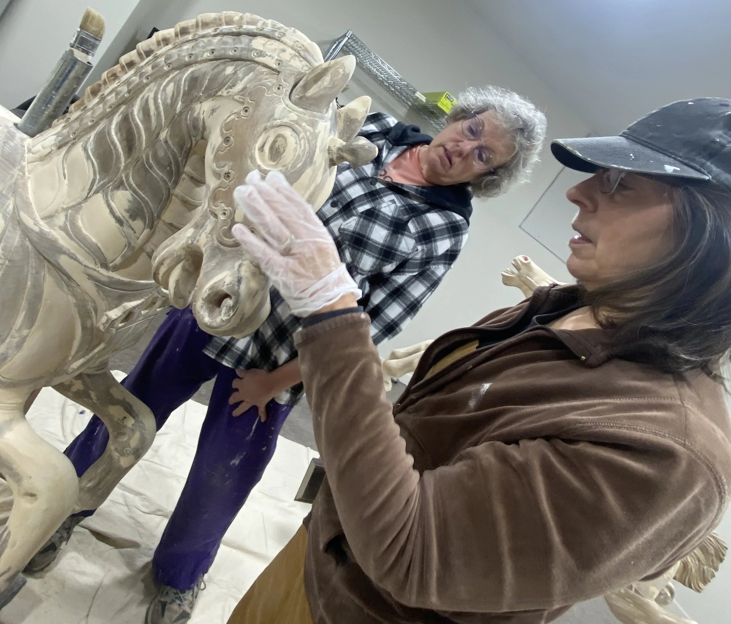 Sally Forster and Therese Wunderlich work on sanding this carved horse after it was stripped of paint and cracks in the wood were filled with resin.