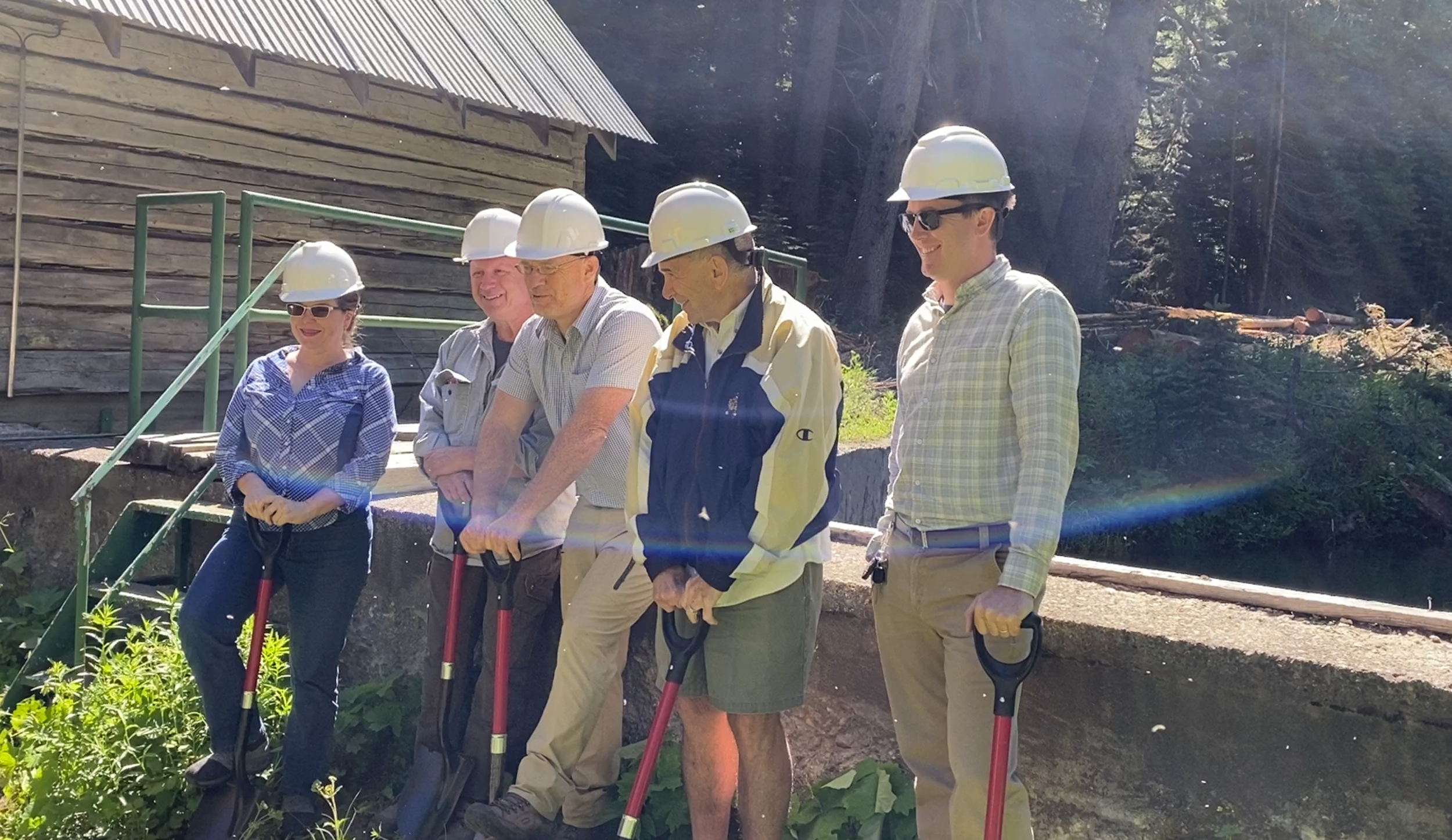 In this image from 2022, then Councilor Darcy Long, Mayor Rich Mays and The Dalles City Manager Matthew Klebes and two others get a photo at the groundbreaking for the Dog River Pipeline - a project that took 10 years to complete, in part because of federal permitting. The US Senate is now considering giving 150 acres near Crow Creek Reservoir to the City of The Dalles, to cut red tape as city embarks on massive rebuild of potable water infrastructure.