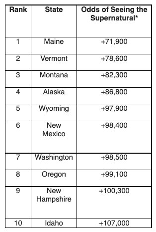 How to read the odds: In Maine 1 in 719 people have reported seeing a supernatural occurrence. In Washington 1 in 985 people have reported a supernatural occurrence. In Oregon 1 in 991 people have reported a supernatural occurrence. Graph from: Great Lakes Stakes
