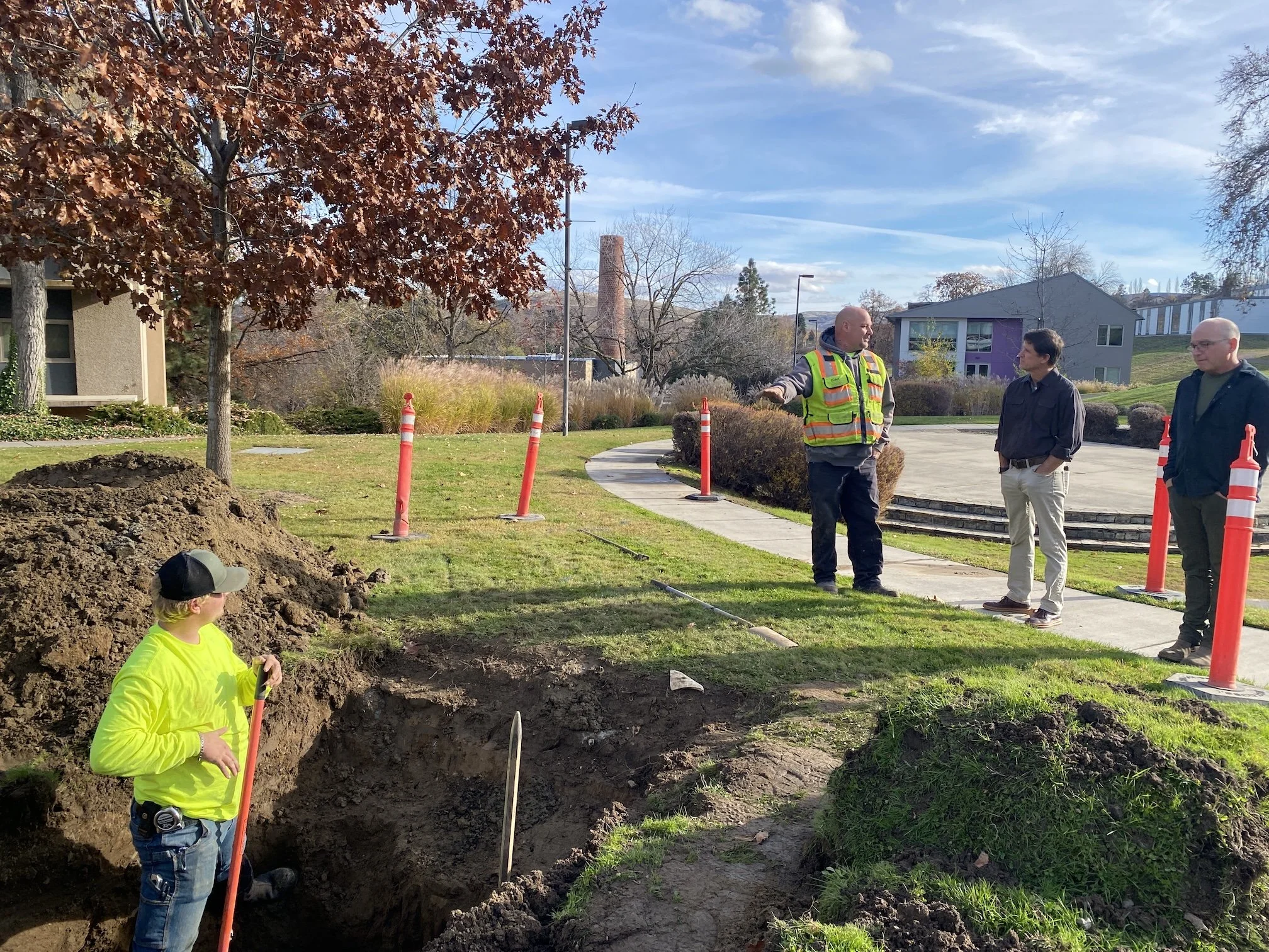 Crestline Construction crew discusses their method for locating the water main break with Columbia Gorge Community College President Dr. Kenny Lawson and College Communications Director Tom Penberthy this morning, Nov. 24