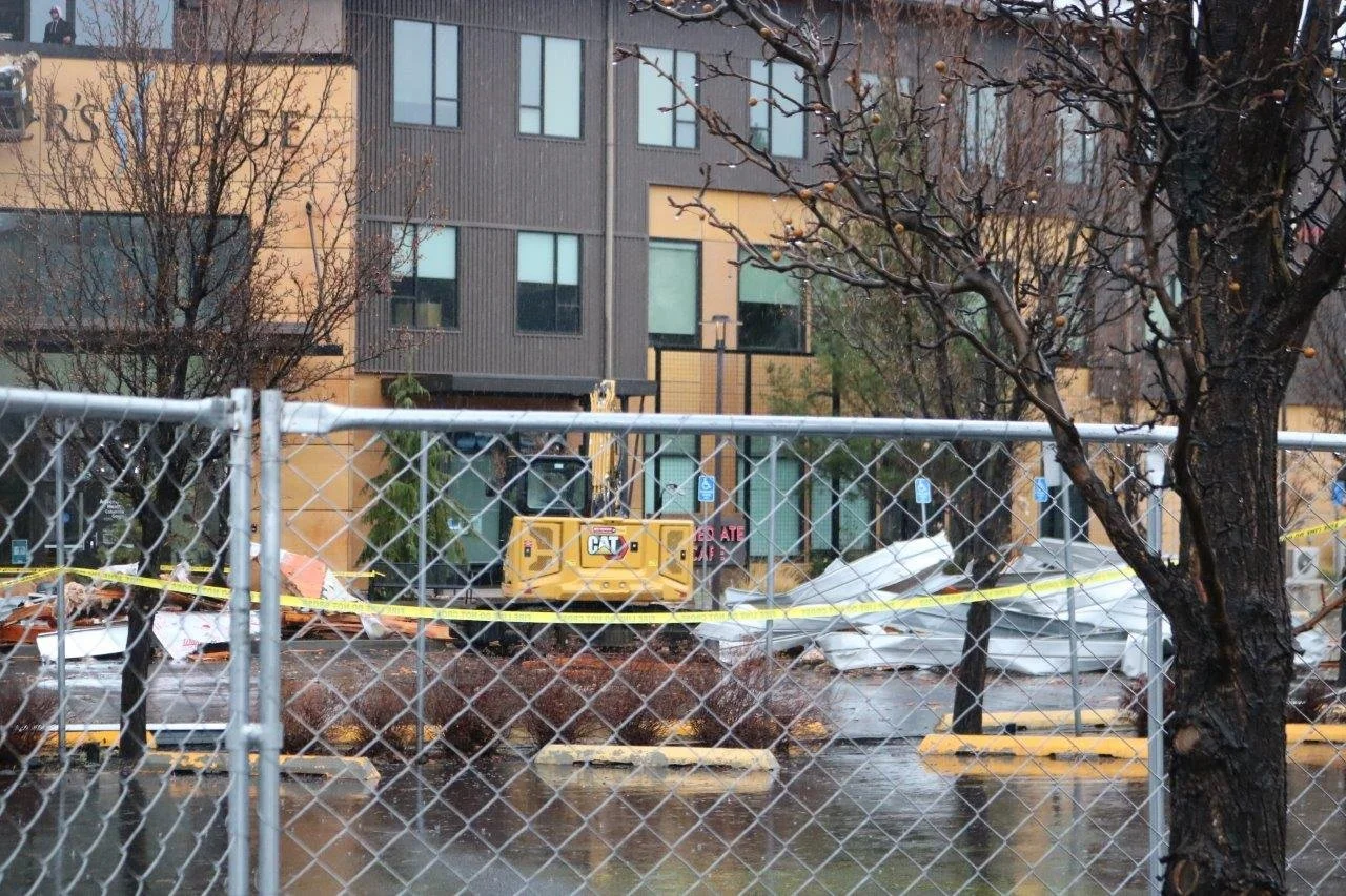 Crews were active at the site Wednesday, with contractors erecting chain-link fencing around the building to secure the area. Heavy equipment operators removed twisted roofing and construction debris from the parking lot, while workers on the second-floor balcony tossed damaged materials into an articulated bucket below.