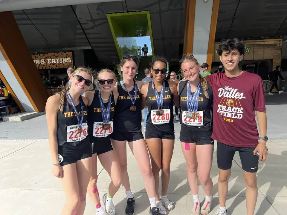 Just like any track and field meet, “it ain’t over til the anchor leg of the 4x400,” and State isn’t just “any meet.” Earlier in the day, the squad had raced in the fast heat to finish 6th in 50.94. Literally and metaphorically hungry by their final race, Amyrah Hill and Madelyn Harrison battled back to stay close on the heels of Scappoose and Hidden Valley, running a little over a minute splits, with senior Zoe Dunn chasing down the home stretch to finish in 4:09.84.