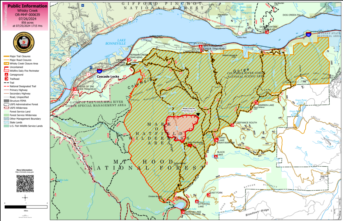 The Mt. Hood National Forest and the Columbia River Gorge National Scenic Area have issued a joint emergency closure for the fire area. Closure information can be found on the Mt. Hood National Forest website Alerts & Closures page at: Whisky Creek Fire Closures in Mark O. Hatfield Wilderness.