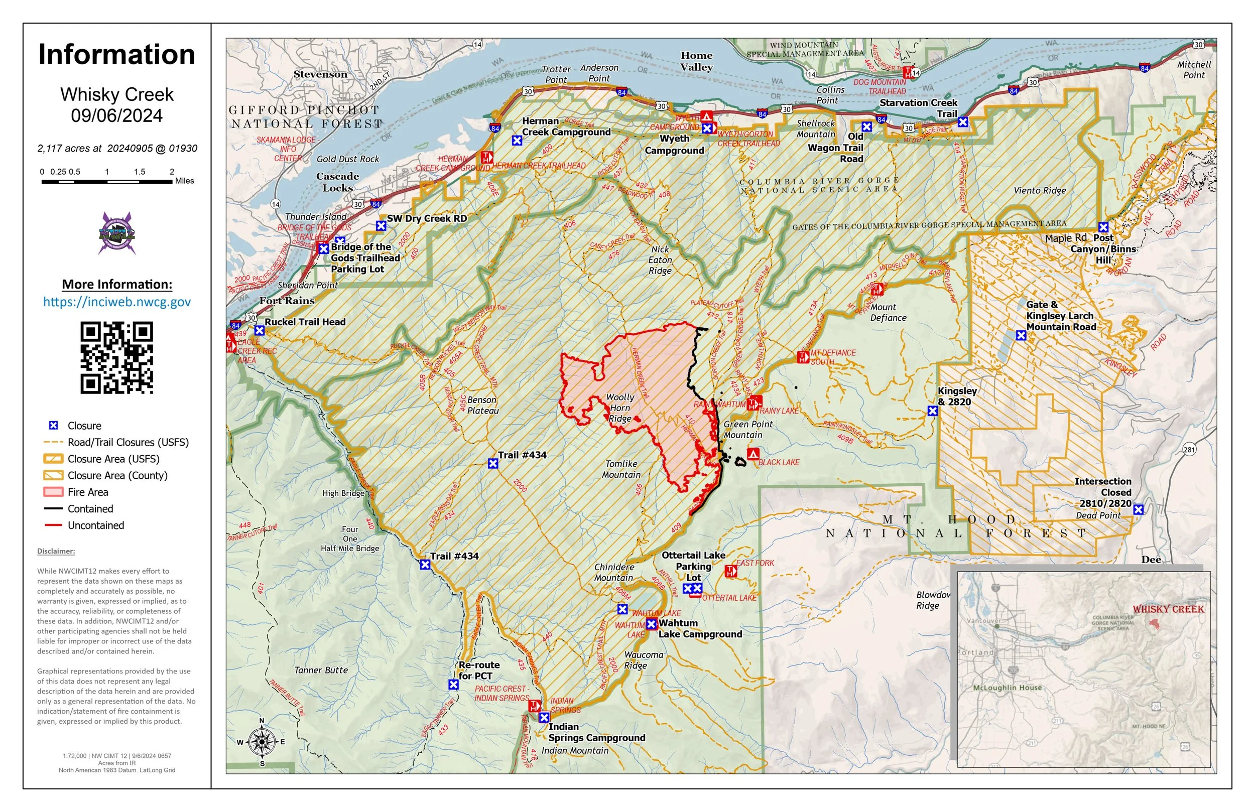 Area closures will remain in the Mt. Hood National Forest, Columbia River Gorge National Scenic Area, and Hood River County. Please respect area closure orders for your safety as well as the safety of our firefighters. Closure information can be found at https://linktr.ee/whisky_creek.2024.