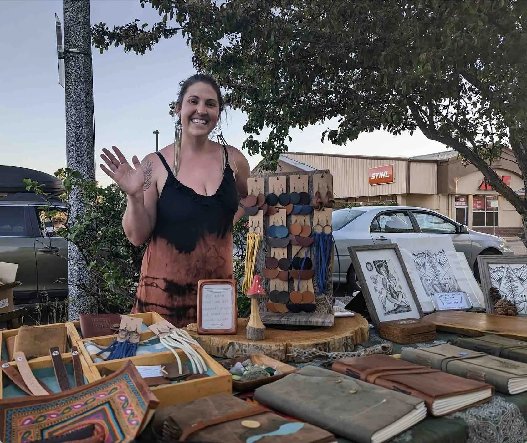 Madison, who runs Rising Roots School, a nature based pre-school in White Salmon was at the artisan market selling her handmade leather jewelry, journals, art books, and art.