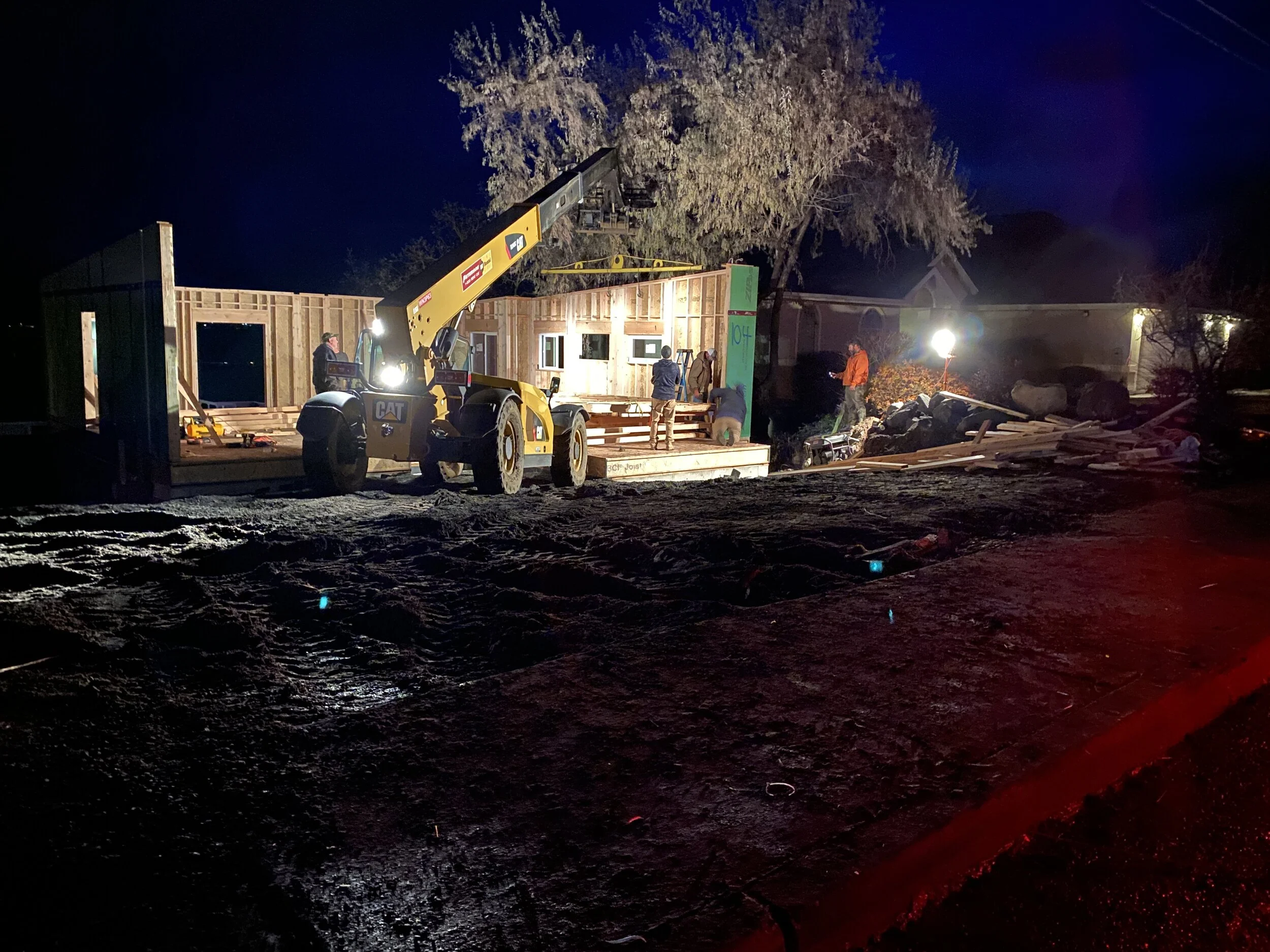 On East 19th Street, crews set up some extra lights on Tuesday evening to assist in the setting of walls at this new home site for Kasey McCullough, a brewmaster and owner of Working Hand Fermentation.